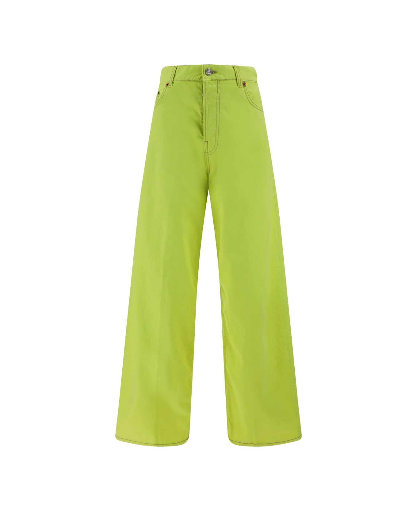 Cotton bethany pants by haikure, straight denim pattern, front button and concealed zipper closure, all-over contrast stitching, five-pocket pattern, leather patch with iconic brand monogram press-stamped and appliqued on contrasting back.