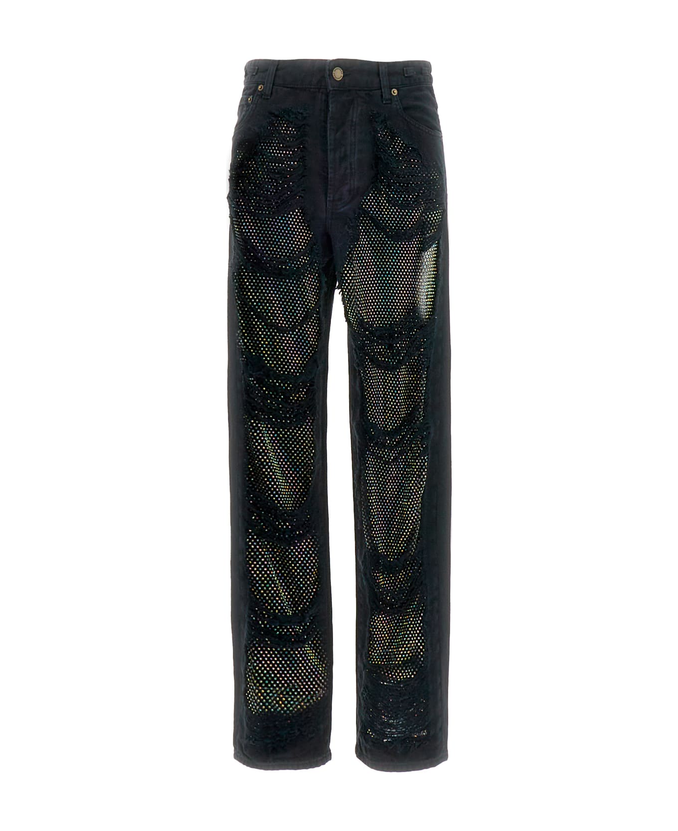 Jeans realized in worn-out effect pure cotton denim with mesh and rhinestones inserts at the front enriched by tonal logoed label at the back. -Belt loops at the waist -Concealed button and a single visible button closure at the front -Five classic pockets