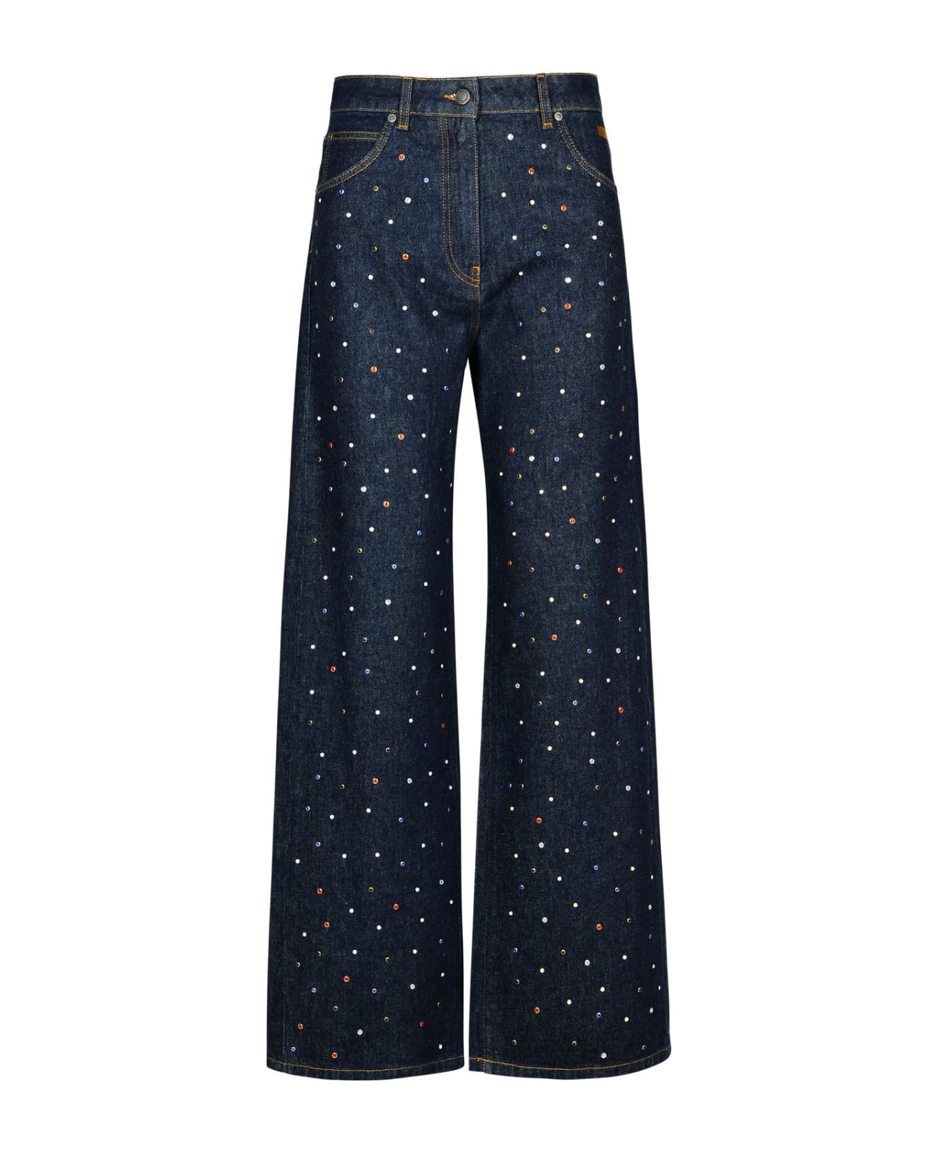 Belt loops, front button and hidden zip closure, five-pocket style, logo embroidery on the front, front rhinestone decoration