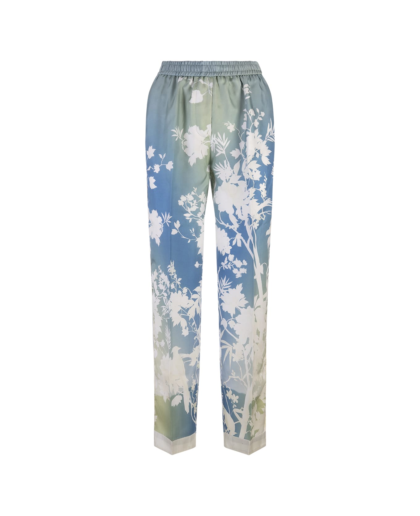 Doride jogger trousers by For Restless Sleepers in green and blue shaded viscose with all-over contrast colour floral print. Model with folded vertical band at the hips and elasticated waist.