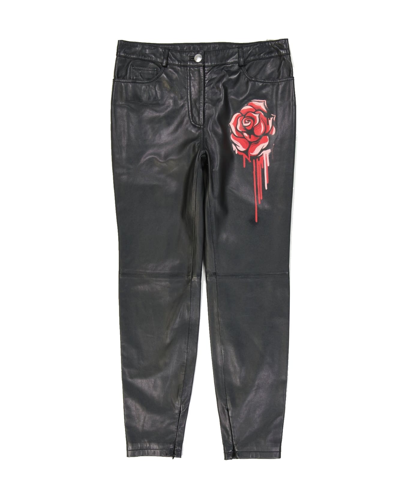 Composition: 100% Leather Belt loops Five pockets Button and zip closure Specialist wash Condition: brand new Front print detail Logo engraved on the buttons Legs zip closure Made in India