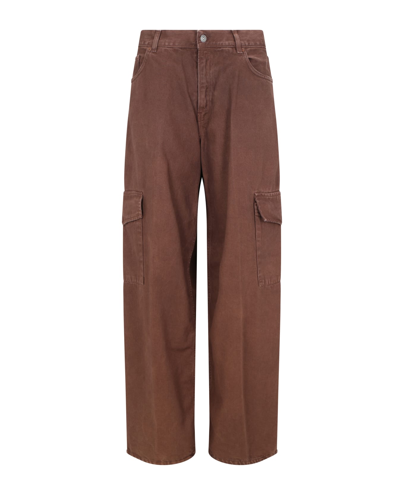 Cotton cargo pants by haikure, belt loops waistband, front button and zipper closure, five-pocket pattern, two large cargo pockets on side panels, wide leg pattern, two large cargo pockets on back, monochrome pattern, oversize fit.