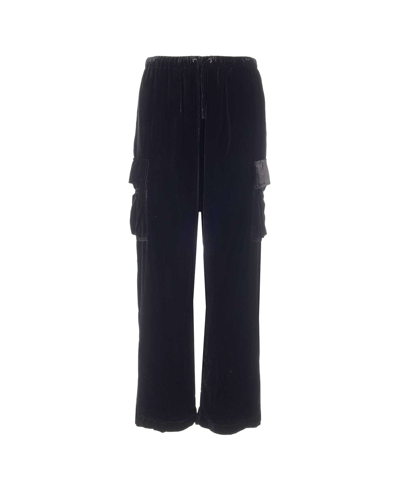 Oversized cargo trousers by Alexander Wang, in black plush velvet with drawstring waist and hidden closure, snap buttons on the cargo pockets.