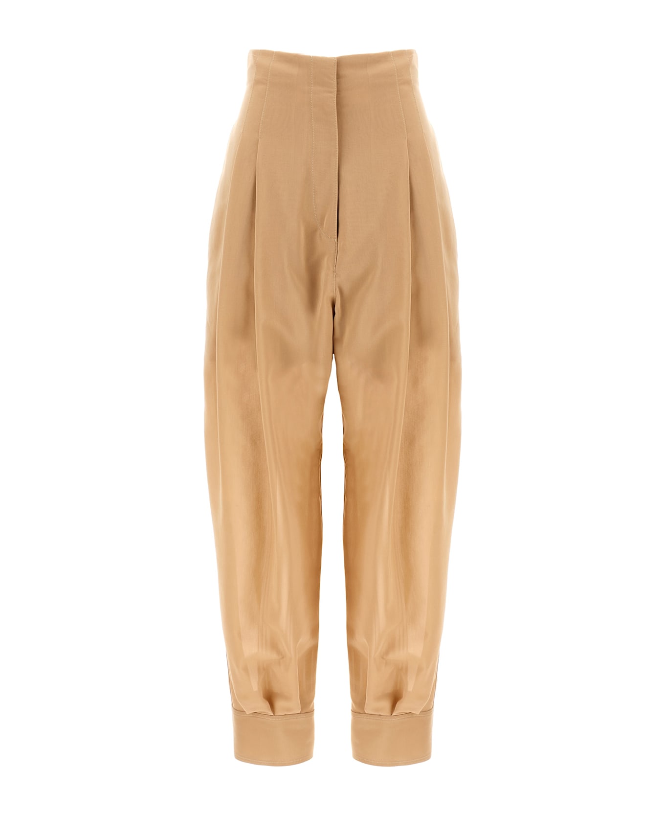 'Carrot' ultra-light semi-transparent cotton blend ethamines, high-waisted model with wide leg, pins, zipper hook and front button closure, pockets, cuffs on the leg bottom, short lining.