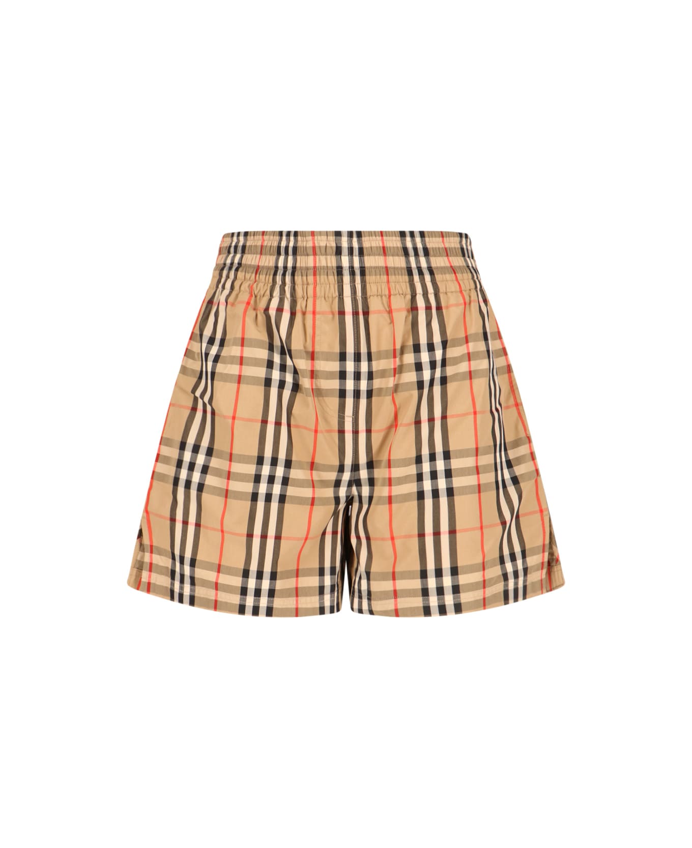 Burberry check shorts in beige cotton with all-over multicolor check pattern, medium elastic waistband, two side pockets, contrasting side details, and straight leg. Composition: 100% Cotton
