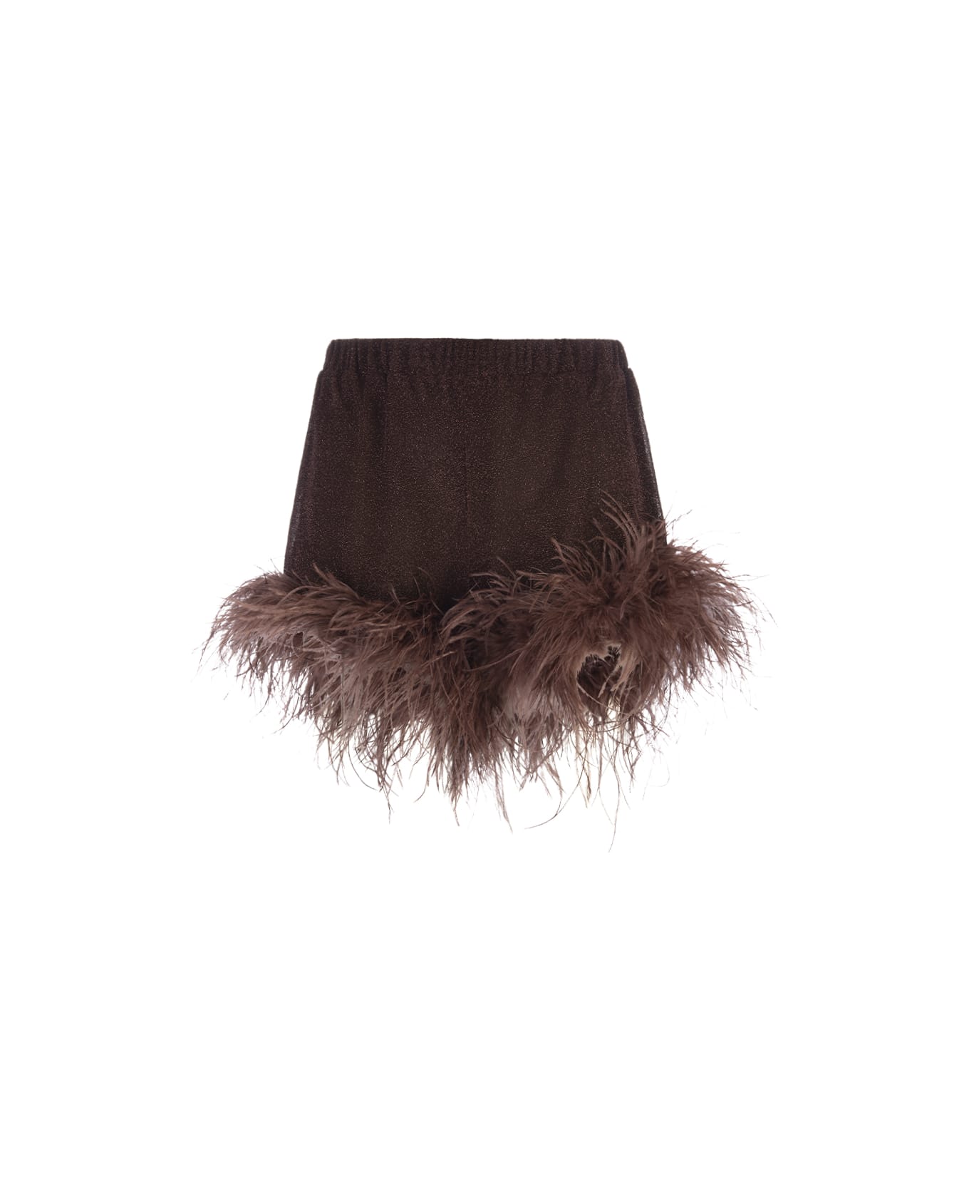 Plumage Lumiere shorts by Oseree made of chocolate-coloured lurex with a straight cut, an elasticated high waist and tonal ostrich feathers applied to the bottom hem.