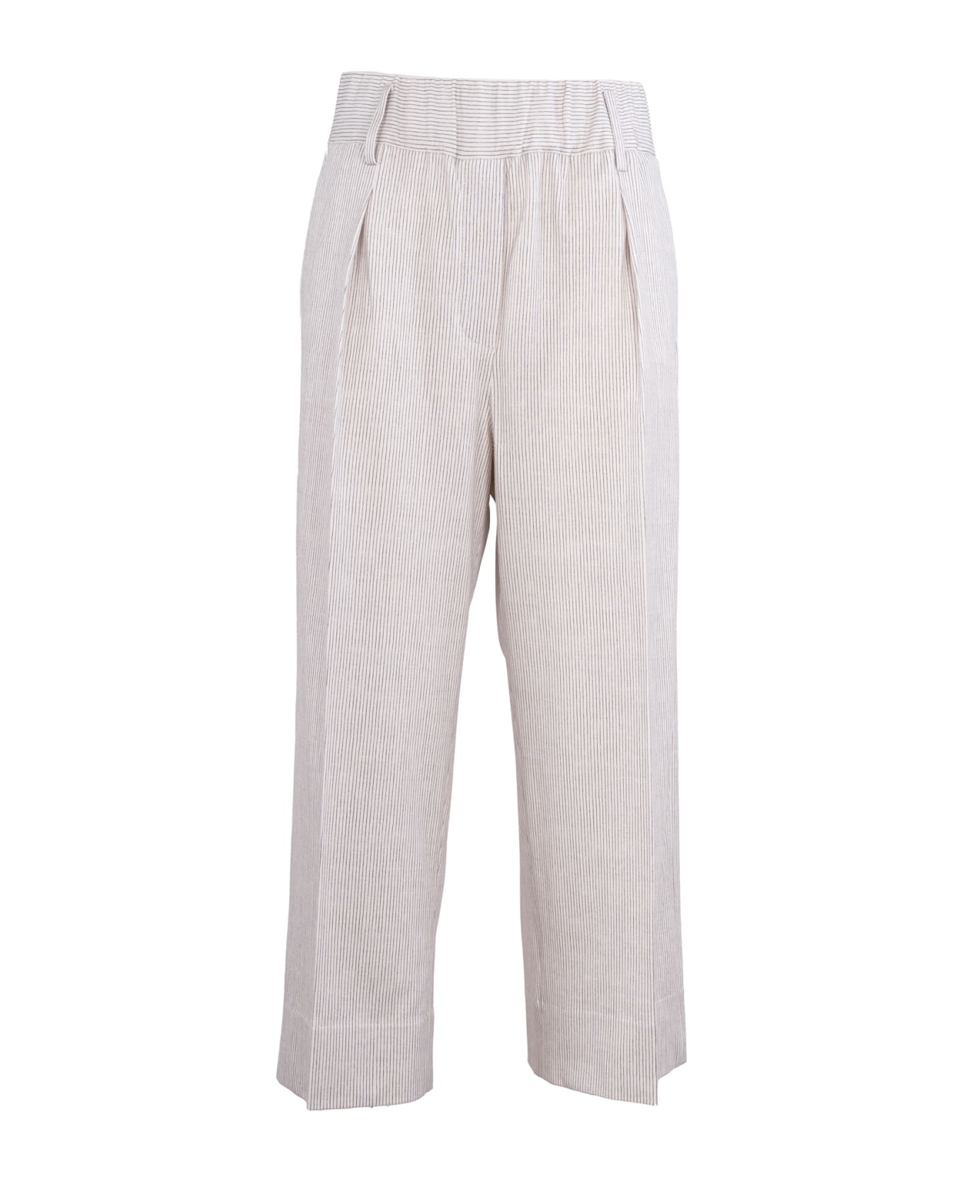 Circolo pants in printed Lisle Piquet. Micro pinstripe. Elasticated waist. Loose fit. A pince. Two side pockets and two rear welt pockets. Trousers: length 91 cm (size S). Composition: 97% cotton 3% elastane. Made in Romania.