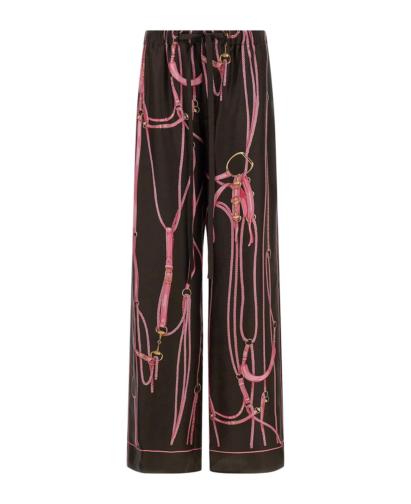Silk pants with all-over clamp print, straight and wide leg pajama model, elastic waistband with drawstring, side pockets. Composition: 100% silk