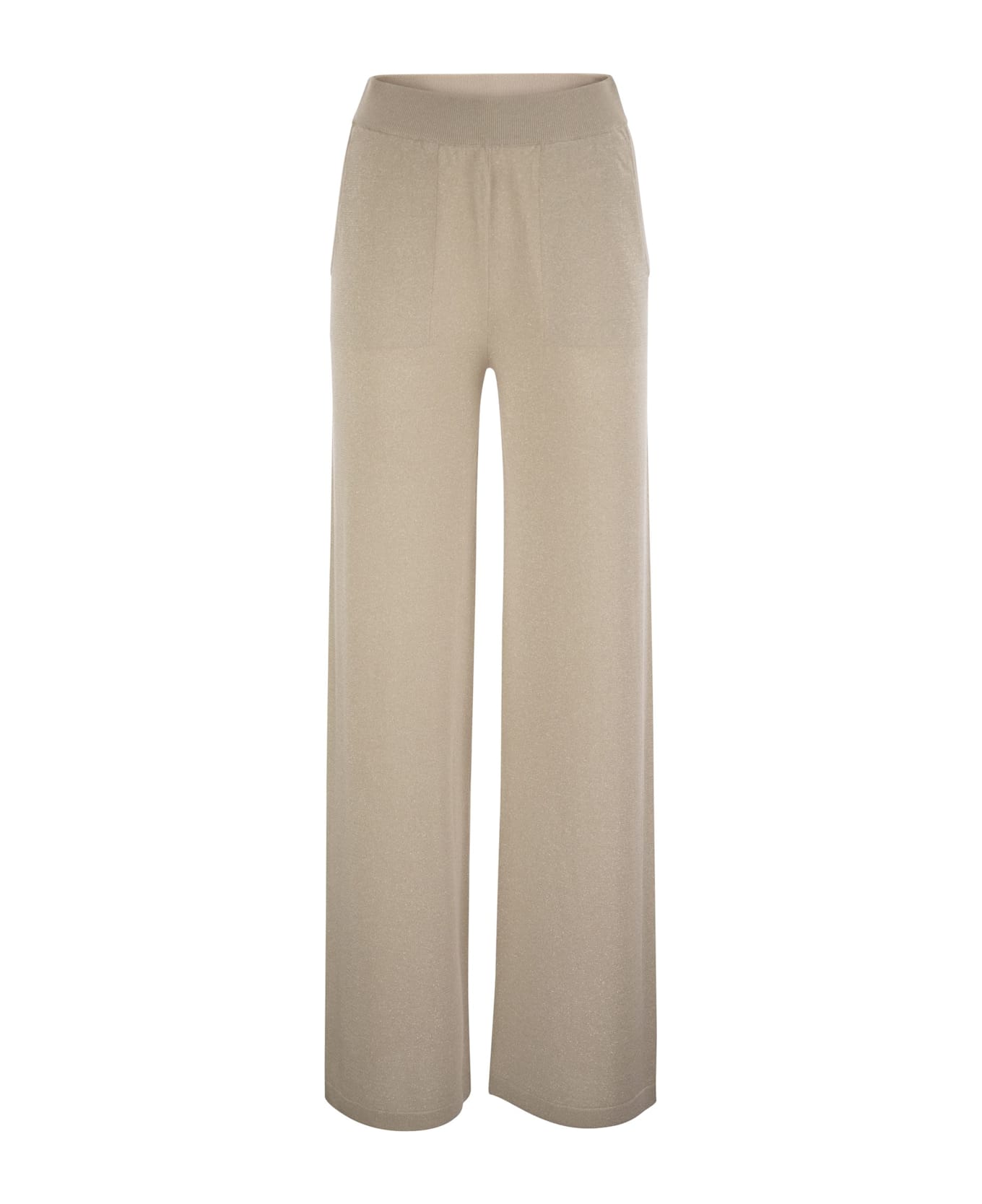 A meeting of brilliance and sophistication. This trouser in vanisé lurex yarn is made with a satin finish that enhances the weave and gives the garment a unique depth. The ribbed waist and bottom finish adds a bold contrast, outlining a clean, modern line. The pure cotton crepe yarn, light and versatile, enriches the design with a texture that catches the light, lending a discreet elegance. - Cotton yarn and lurex trousers - Shaved vanisé workmanship - Ribbed waist and bottom hem - Palazzo line - Regular fit DESIGNER ID: S94096F14G9173 G42