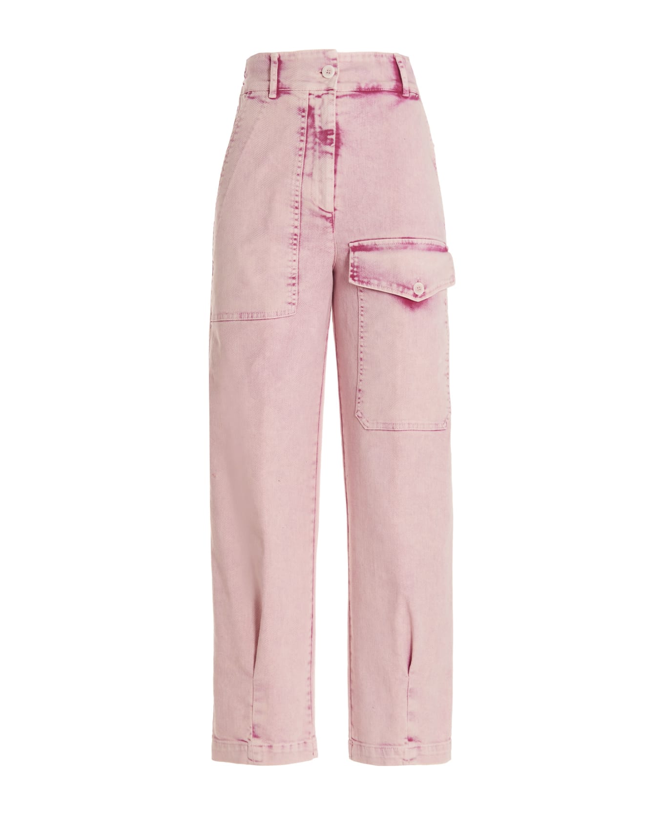 Délavé-effect cotton trousers with a zip and button fastening, pockets and an elasticized insert at the waist.