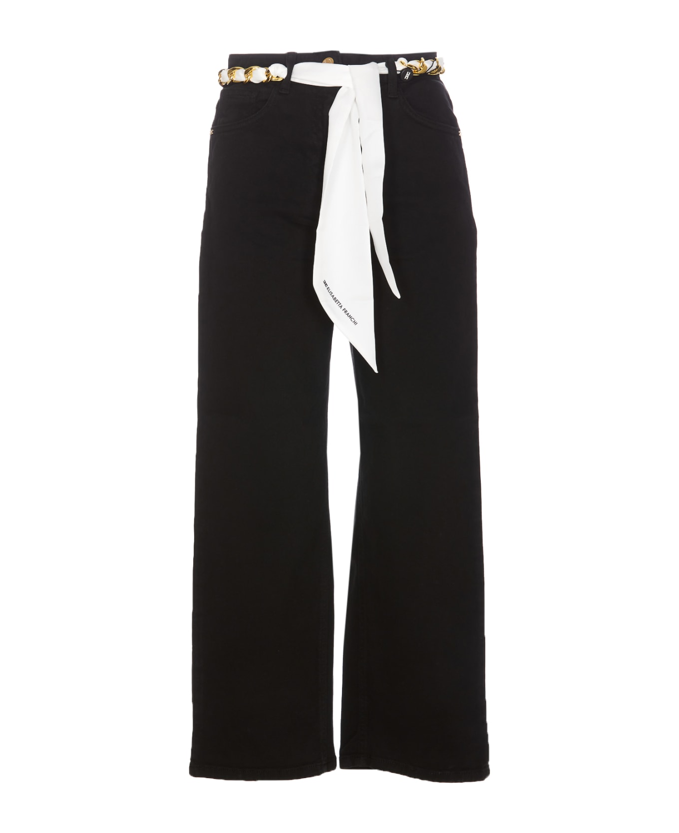 Elisabetta Franchi black jeans with frontal button and zip closure, wide leg, belt detail on waist, 5 pockets, patch golden logo on the back Composition: 99% Cotton, 1% Elastane