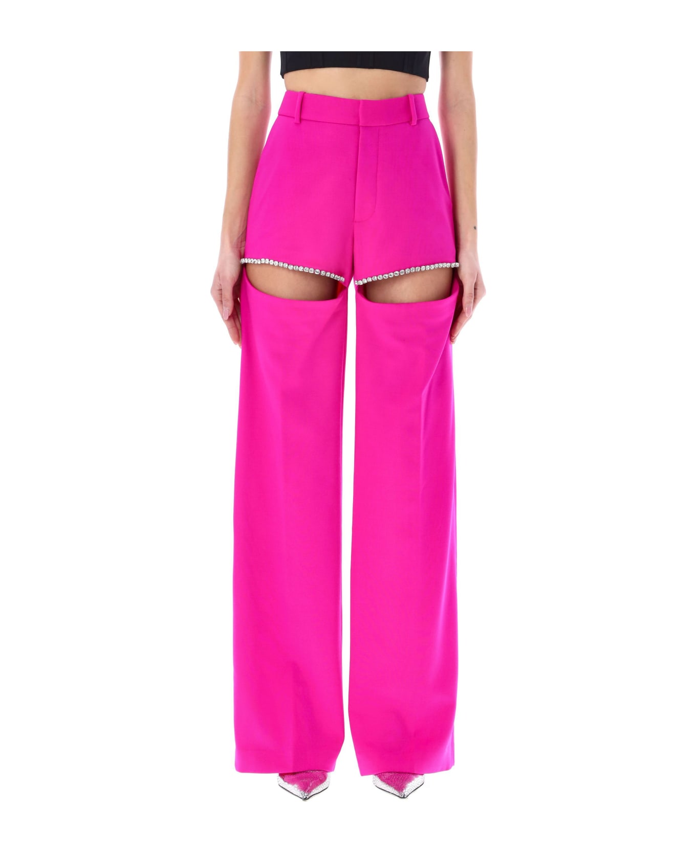 Wool Cut-out Pants By Area. Featuring: Concealed Hook And Zip Fly Belt Loops Side Pockets Rear Welt Pocket Cut-out At Front With Crystals Trim Wide Leg The Model Is 1,72 M Tall And She's Wearing Size 4