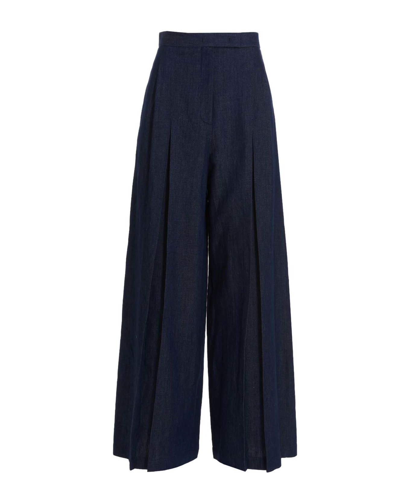 Long denim pants with zip, hook-and-eye and button closure and a loose leg.