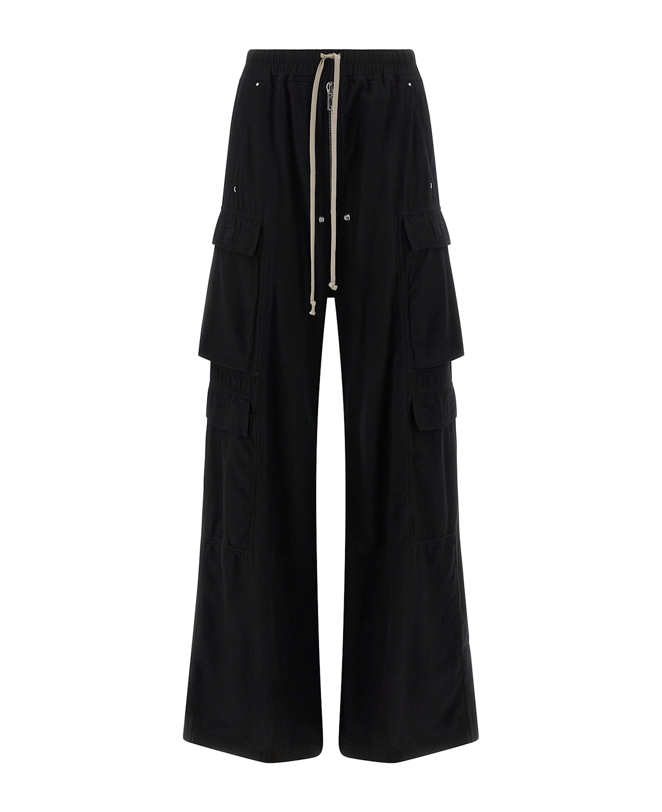 'Double Cargo Jumbo Belas' light cotton trousers with low crotch and flared wide leg, adjustable drawstring elastic at the waist, pockets, zip flap.