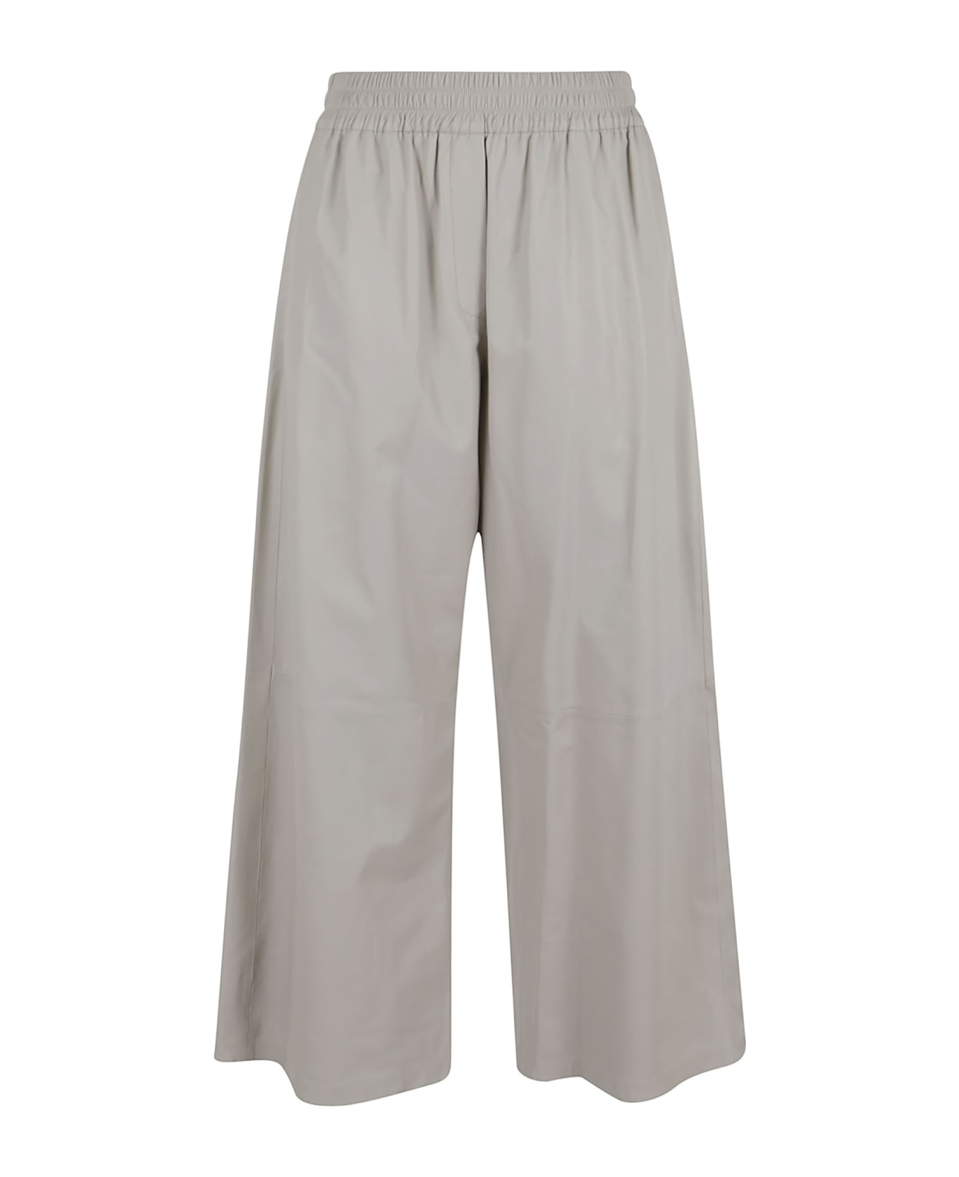 leather trousers with wide elastic waistband both on the leg and on the bottom