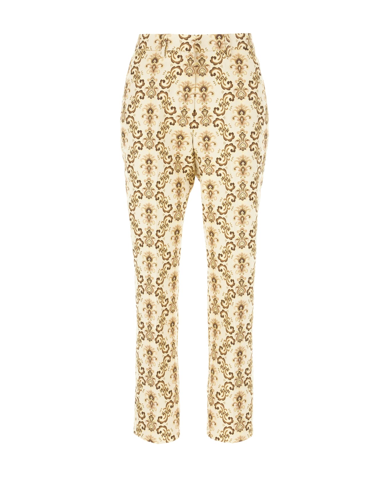 Pants realized in polyester blend characterized by peculiar embroidery with lurex threads on the entire surface. -Belt loops at the waist -Concealed zip, hooks and button closure -Slant pockets and two slit pockets at the back -Central ironed pleat Composition: Exterior: 49% Polyester 48% Cotton 4% Metallic fiber 1% Nylon