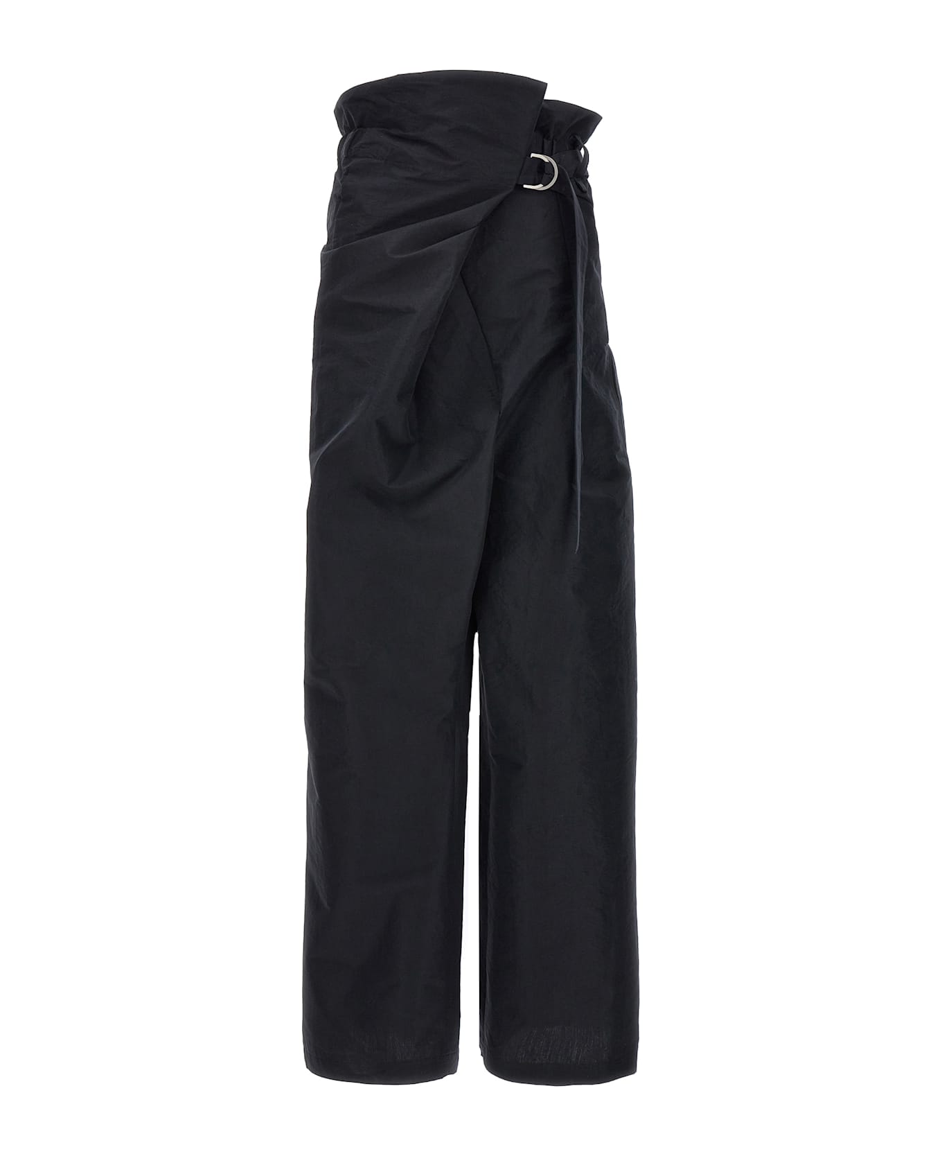 'Enfold' cotton blend trousers with elastic waistband, adjustable strap, pockets.