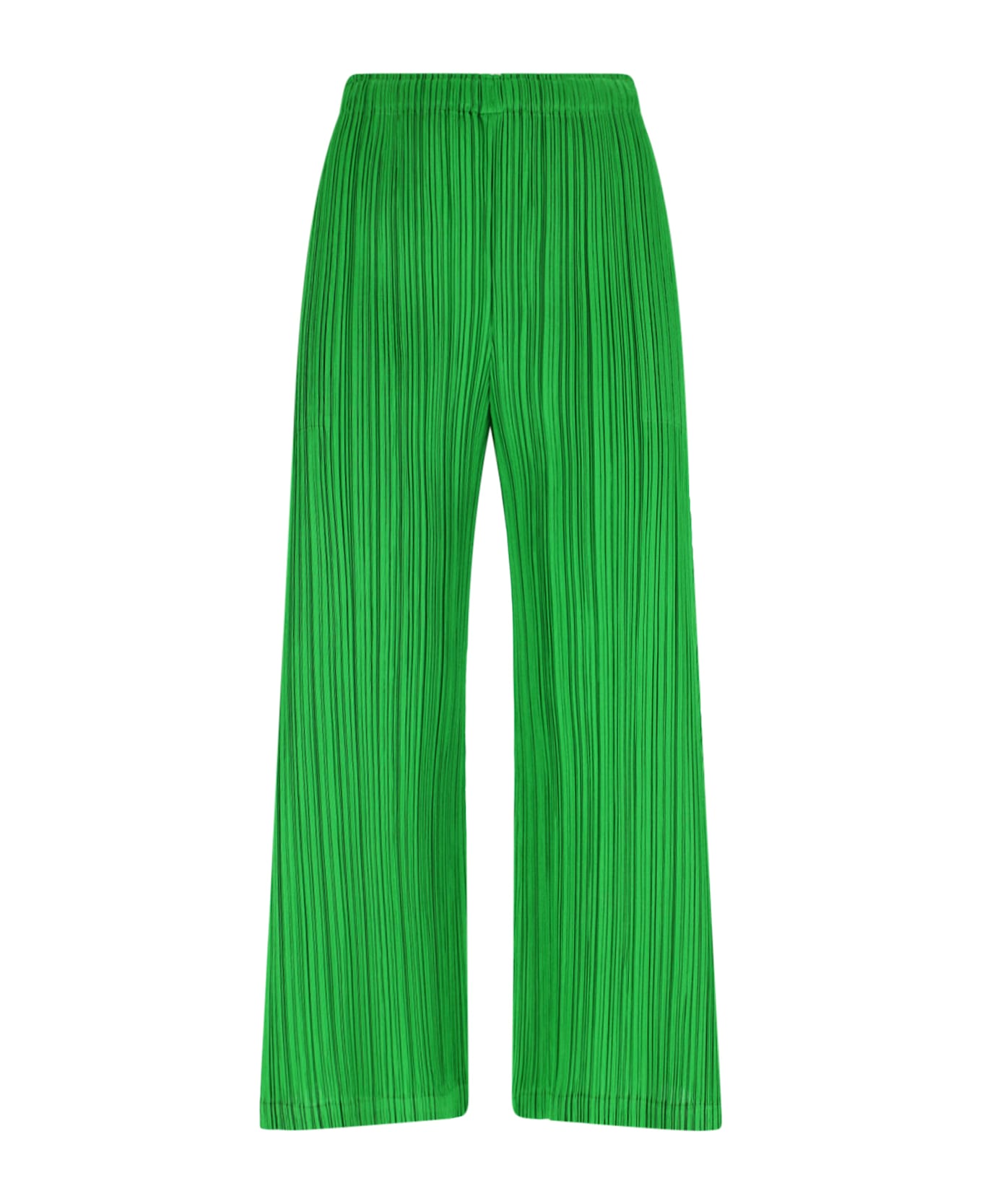 Pleats Please 'February' pleated pants in green fabric with pleated pattern, medium elastic waistband, two side pockets, side slits, wide leg. Composition: 100% Polyester