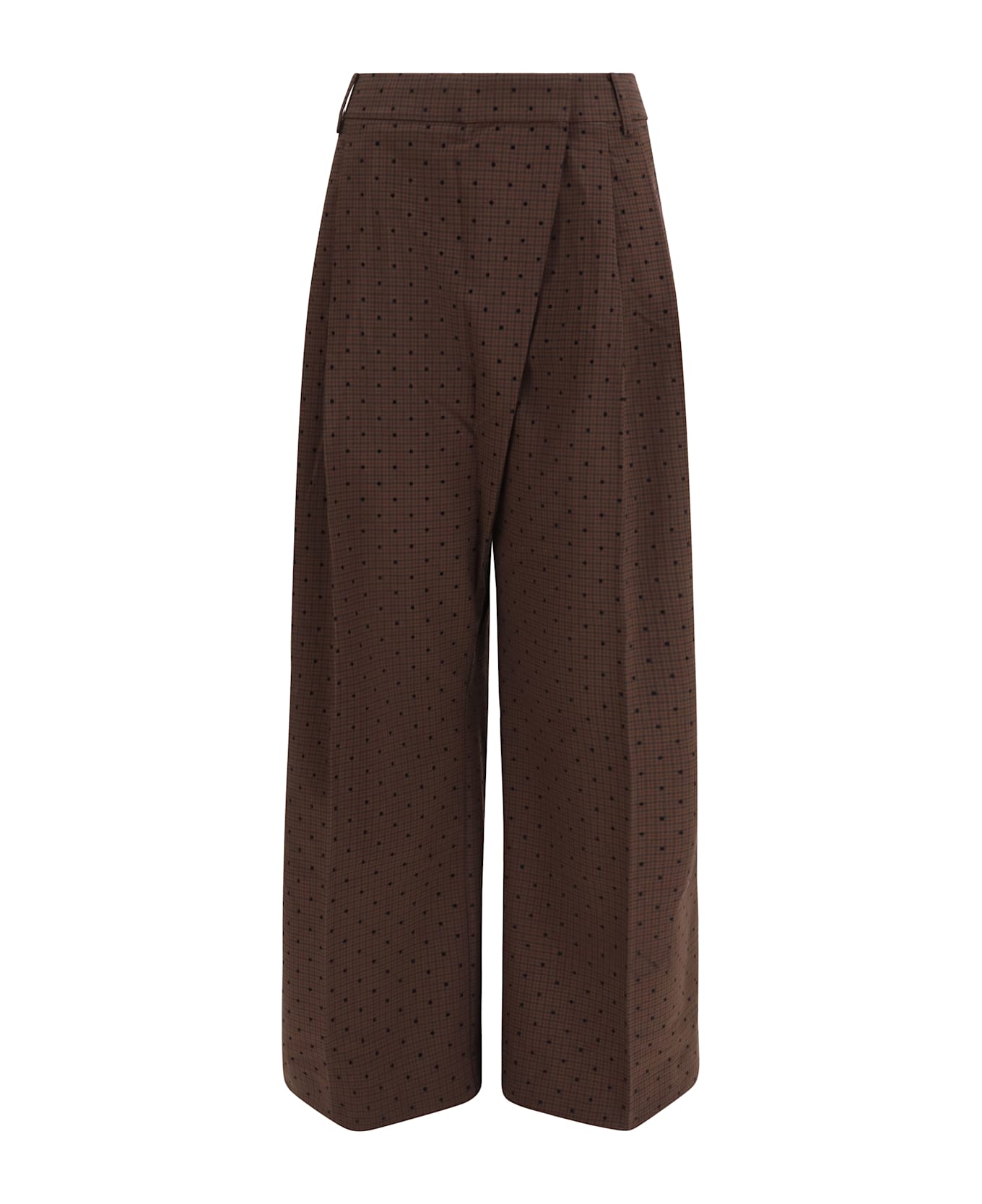 The flocked plaid crossover pants by ganni combine style and comfort in a sophisticated design. the flocked check print and crossover front detail create a distinctive effect, while the hook-and-eye closure and belt loops offer practicality. side pockets and a ganni logo patch on the back pocket add functionality and a touch of personality. perfect for casual-chic looks, these pants are ideal for modern, versatile elegance.