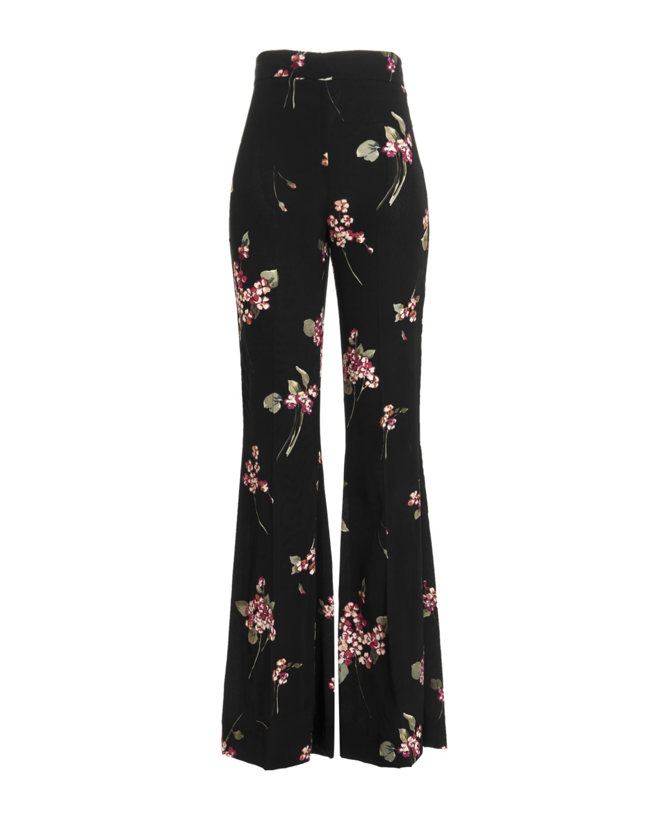 pants with all-over floral print, side zip closure and a flared wide leg.