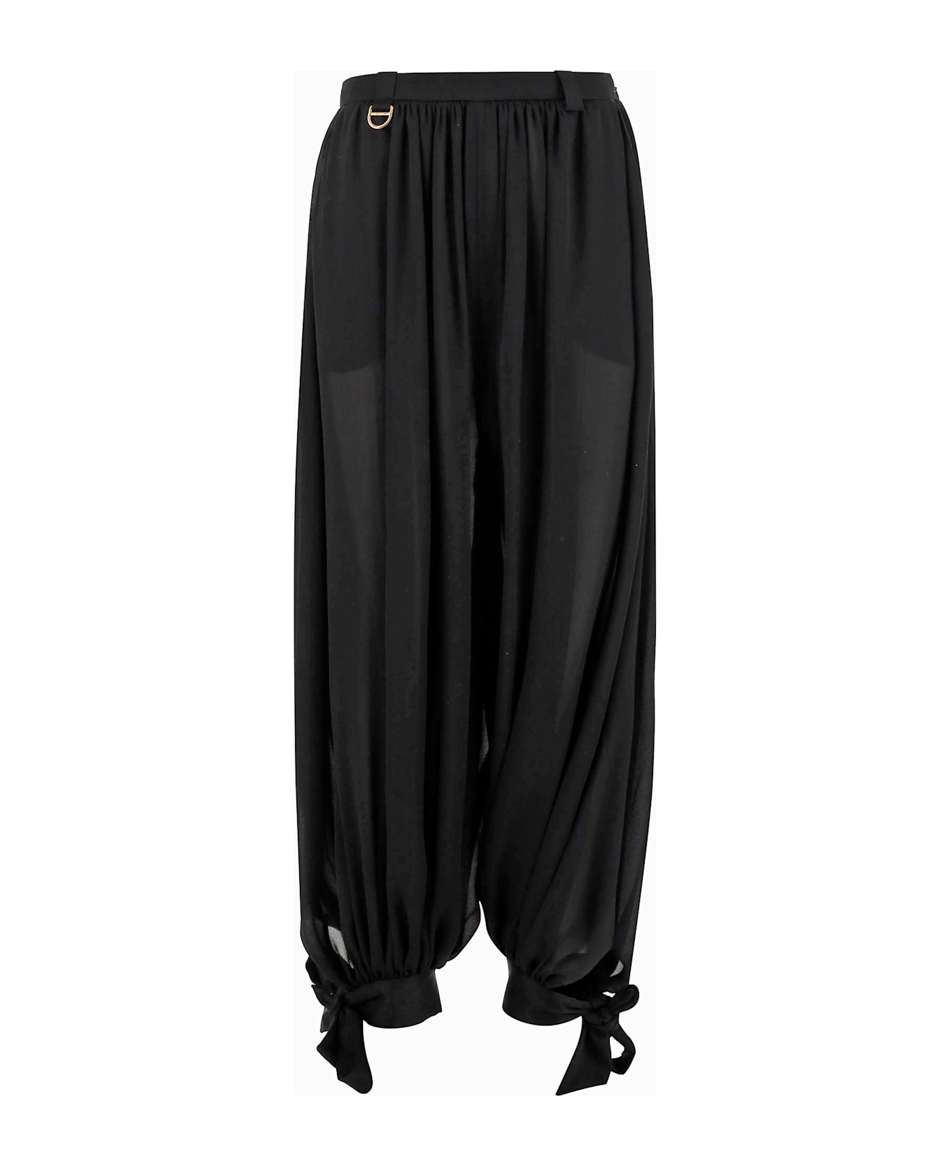 Pants made from silk Zipper on the left side Side pockets Fabric-covered buttons at ankles Gold-colored D-ring on the right hip Black Made in France Composition: 100% silk