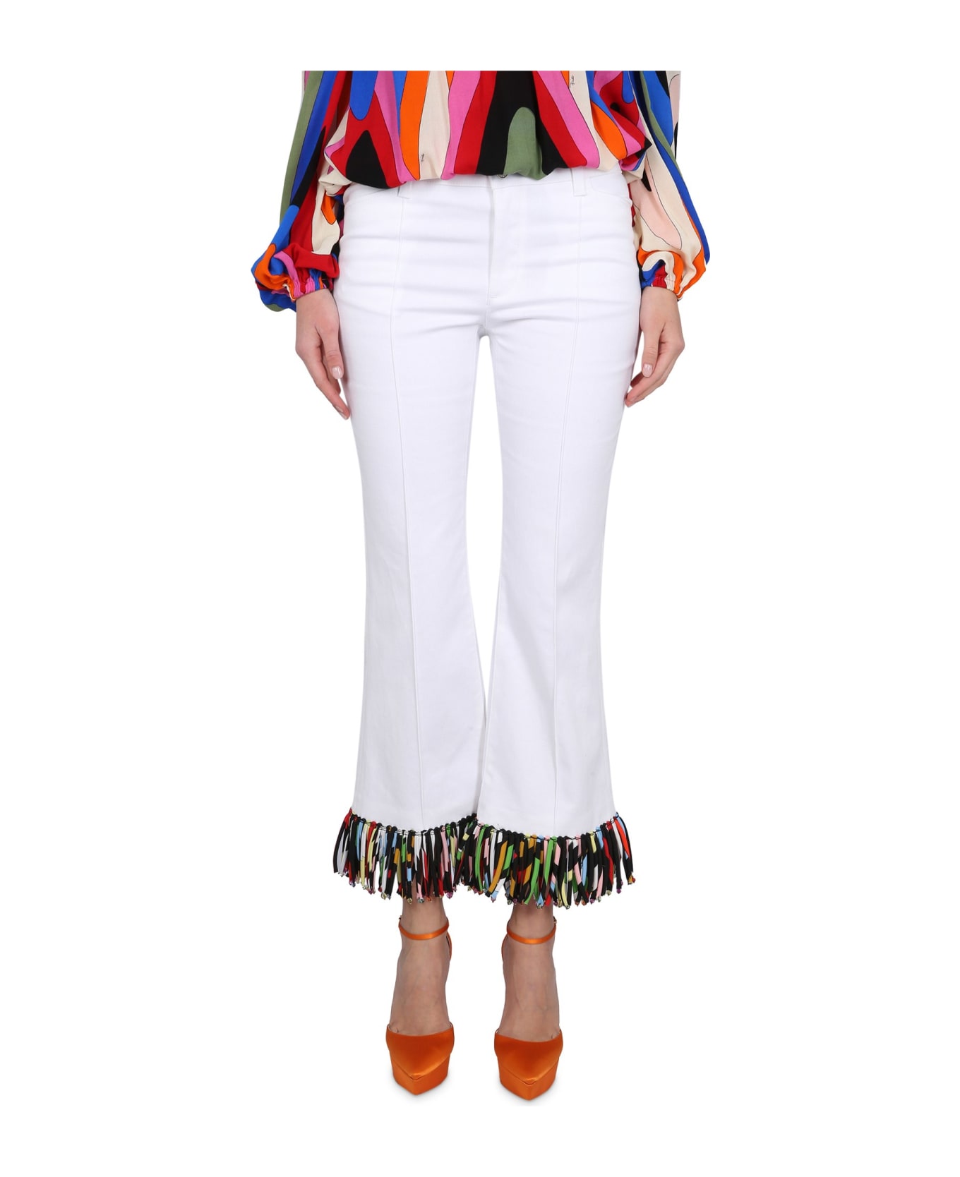 - Button Closure- Two Side Pockets- Two Back Pockets- Flared Bottom- Bangs Applied To The Bottom- 99% Cotton, 1% Elastane- Made In Italy- The Model Is 180 Cm Tall And Wears Size 40 It