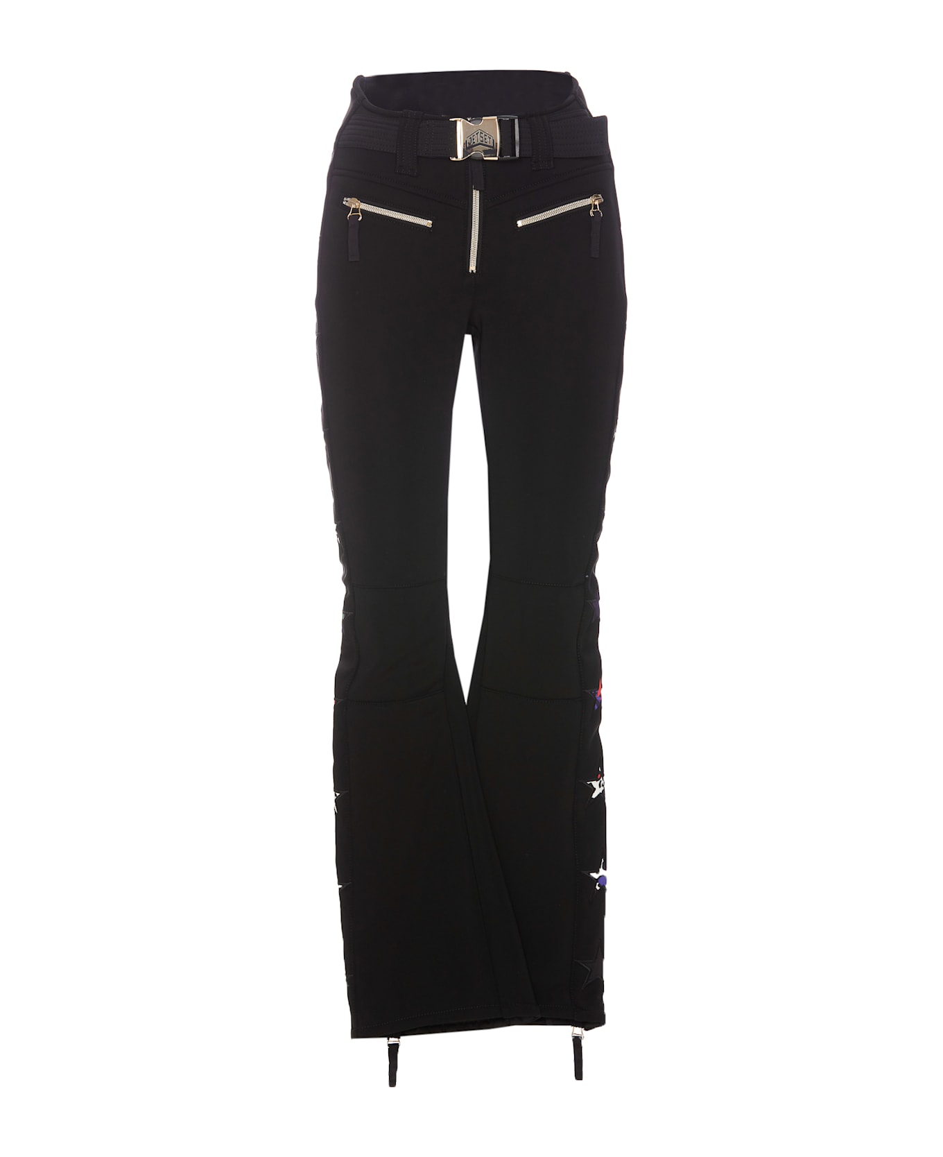 Jet Set black Fun ski pants, frontal zip closure, zipped pockets, lateral stars details, tone on tone logo on the back,belt detail, lateral zipped