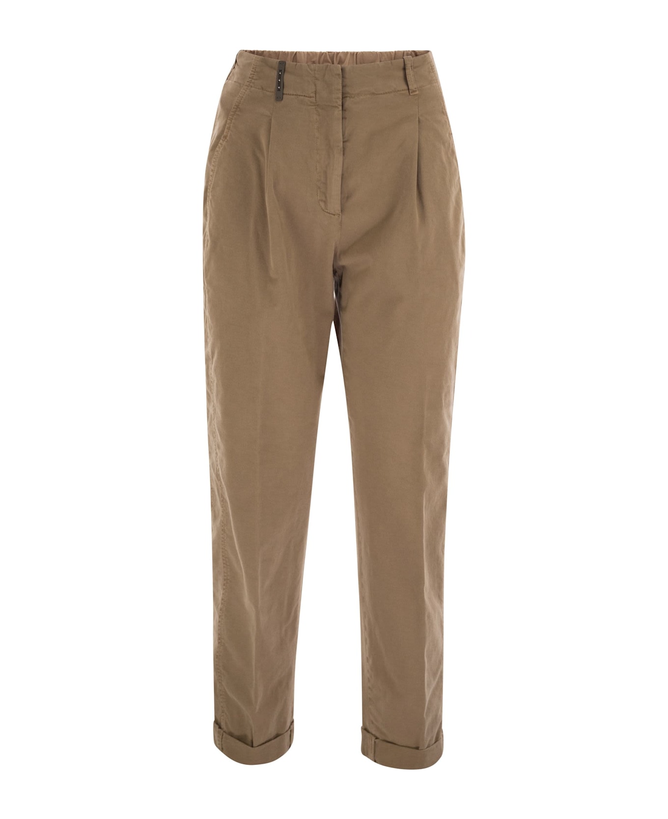 Contemporary in style, these garment-dyed trousers in lightweight stretch cotton gabardine are a must-have for the season. The carrot fit, with a high waist and darts, defines a sleek and modern silhouette, while the elasticated back ensures a precise fit. This trouser is the ideal choice for an urban look. - Garment dyed pleated trousers - Elasticated waistband at back - Pockets along the hips, double welt on the back - Turned hem 3+3 cm - Carrot fit - High waist - Front zip and concealed hook-and-eye closure DESIGNER ID: P04610T302481 048