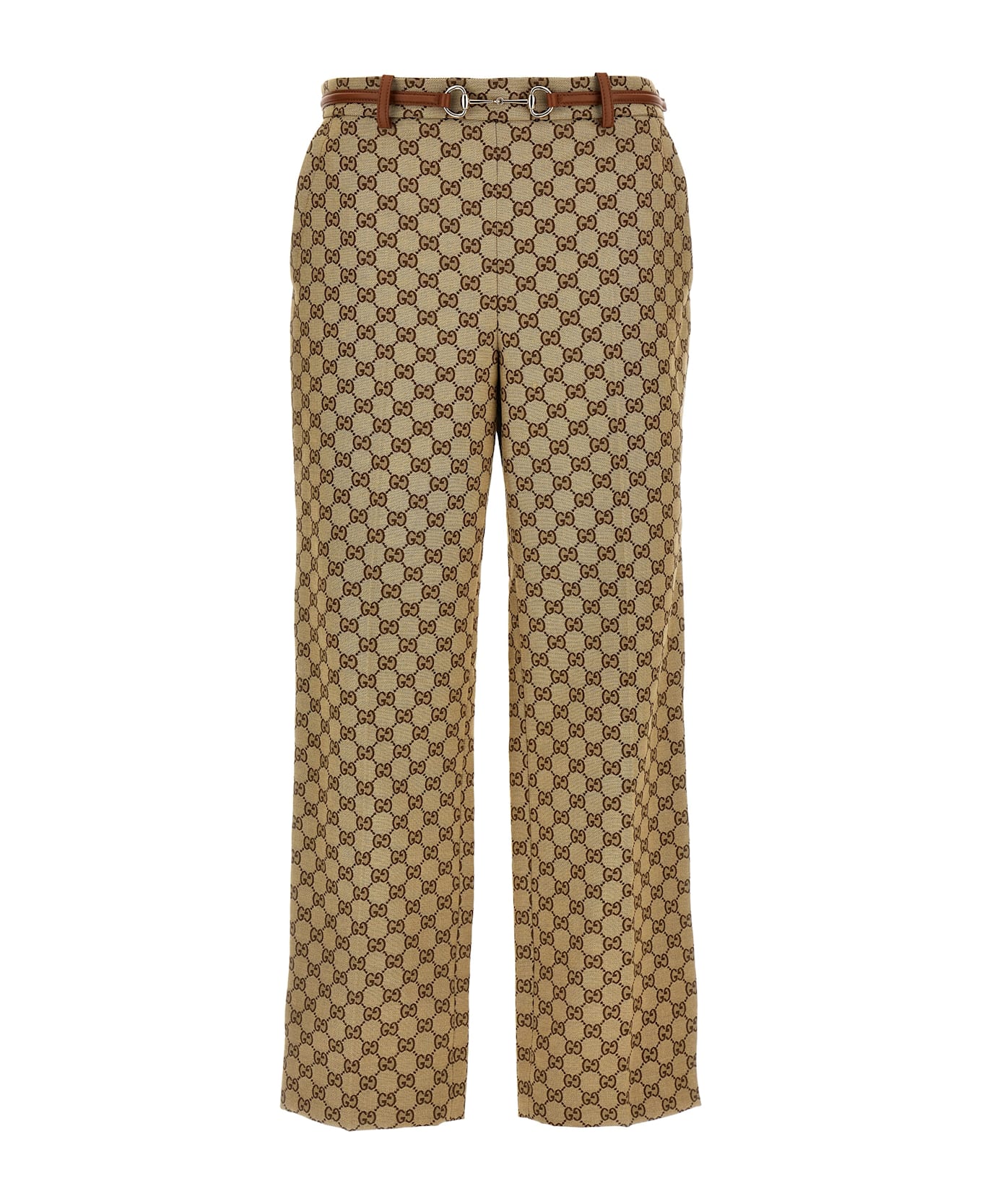 'GG' fabric trousers, leather belt with front clamp, leather trim, front stretched pleat, pockets.