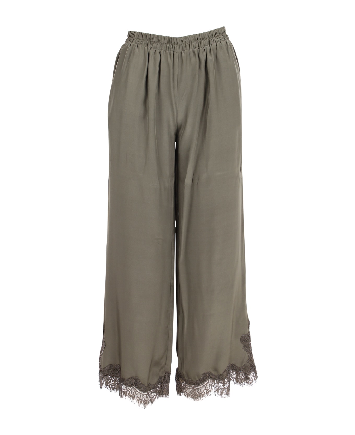 Wide leg pants in silk with side and back pockets, short leg slits, and matching belt, leg hems and slits are finished with lace by Gold Hawk