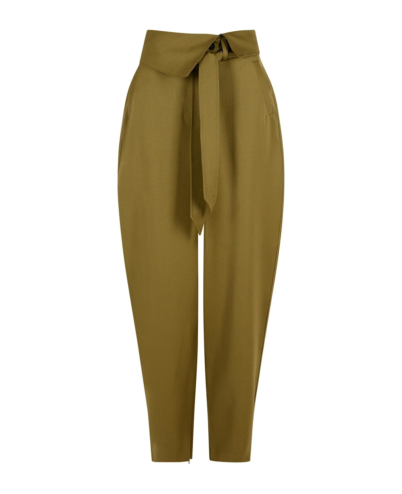 Knotted belt at waist and loops, top turn-up with hook, button closure, side welt pockets, back welt pockets, regular fit, carrot cut Composition: