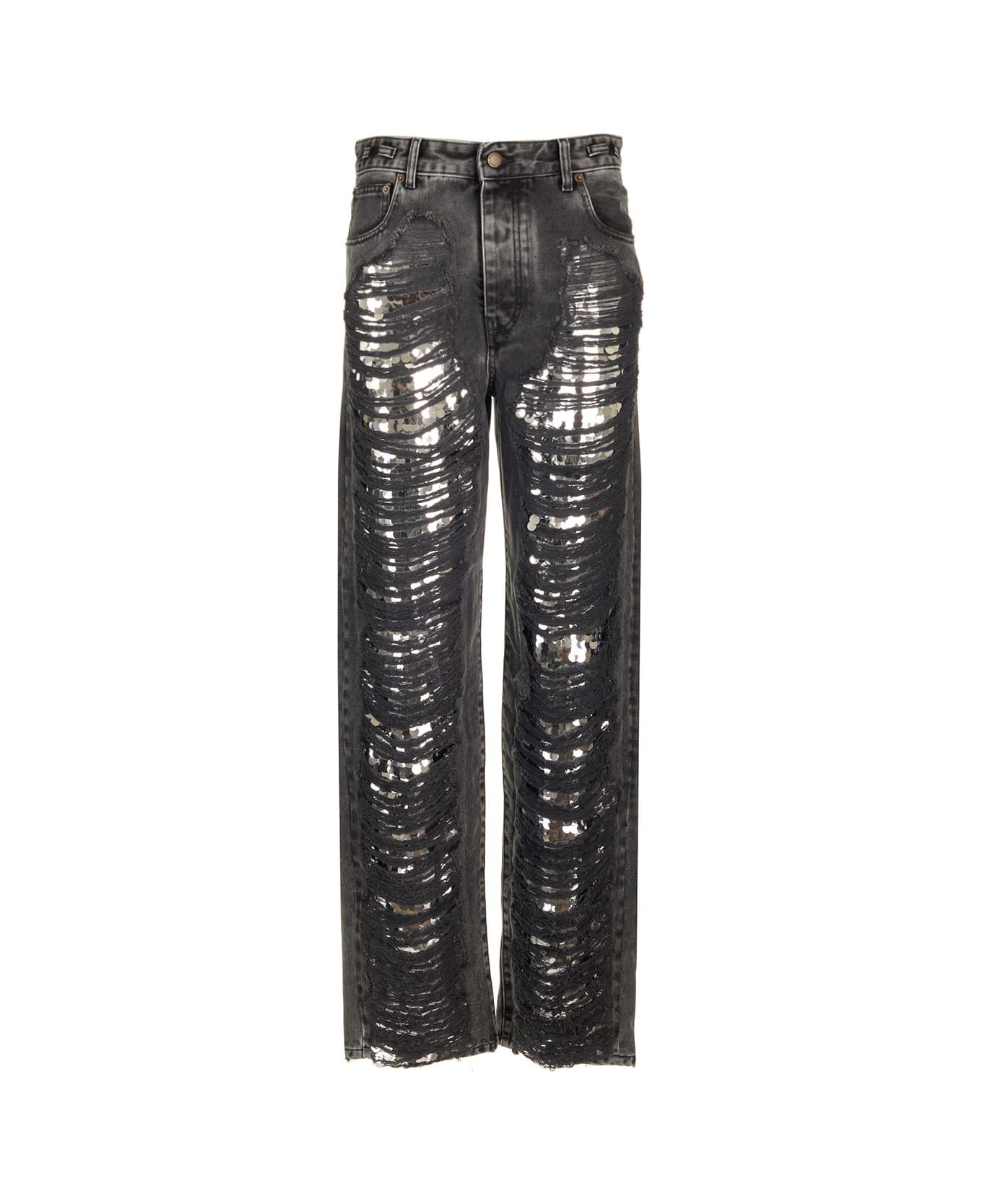 'Karen' denim from Darkpark in black denim with a light gray washed finish, with tears embellished with crystal decorations, 5 pocket design and relaxed silhouette.