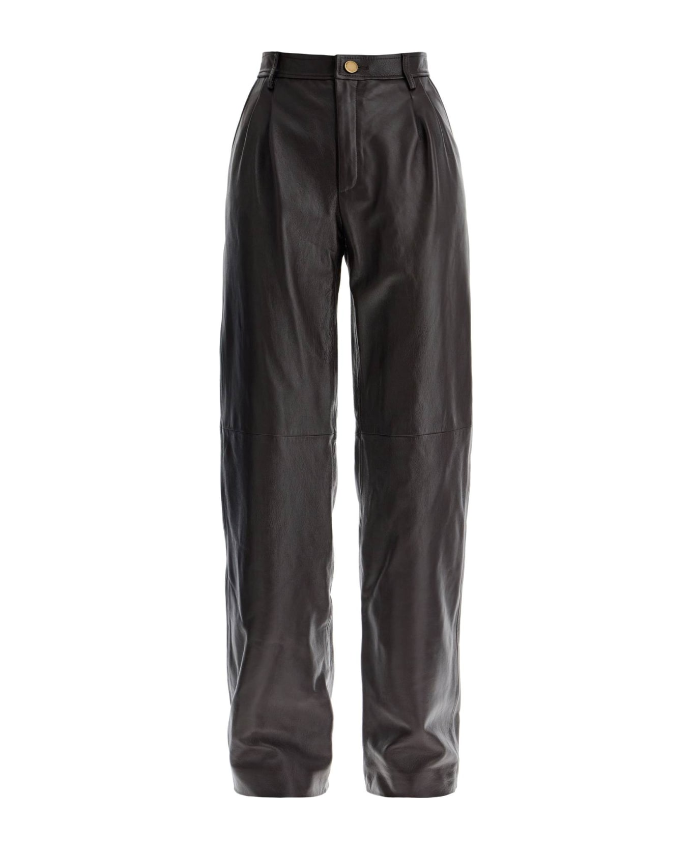 Alessandra Rich's carrot pants are made of soft, garnet-colored leather. They feature a hidden zip and branded button closure, French pockets, welt pockets on the back, and a high waist with front darts. The fit is regular with straight legs. Fully lined. The model is 177 cm tall and wears size IT 40.