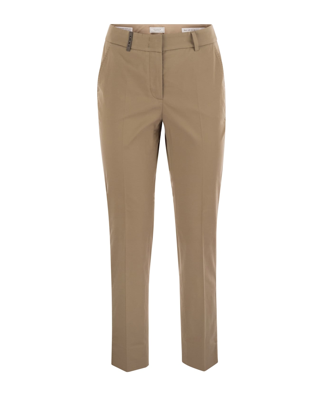 A garment that defines the figure with discretion and style: the cigarette trouser is a perfect choice for those looking for an elegant and contemporary look. Made of light stretch cotton satin, the 4718 trouser is a true icon of the Peserico collections, capable of enhancing every silhouette with elegance. A classic that never loses its topicality, perfect for a versatile look, suitable for any occasion. - Cigarette trousers - America pockets on the front - Double welt pockets with button on the back - Bottom with slits - Slim fit - Regular waist - Front zip and concealed hook-and-eye closure DESIGNER ID: P0471801964 048