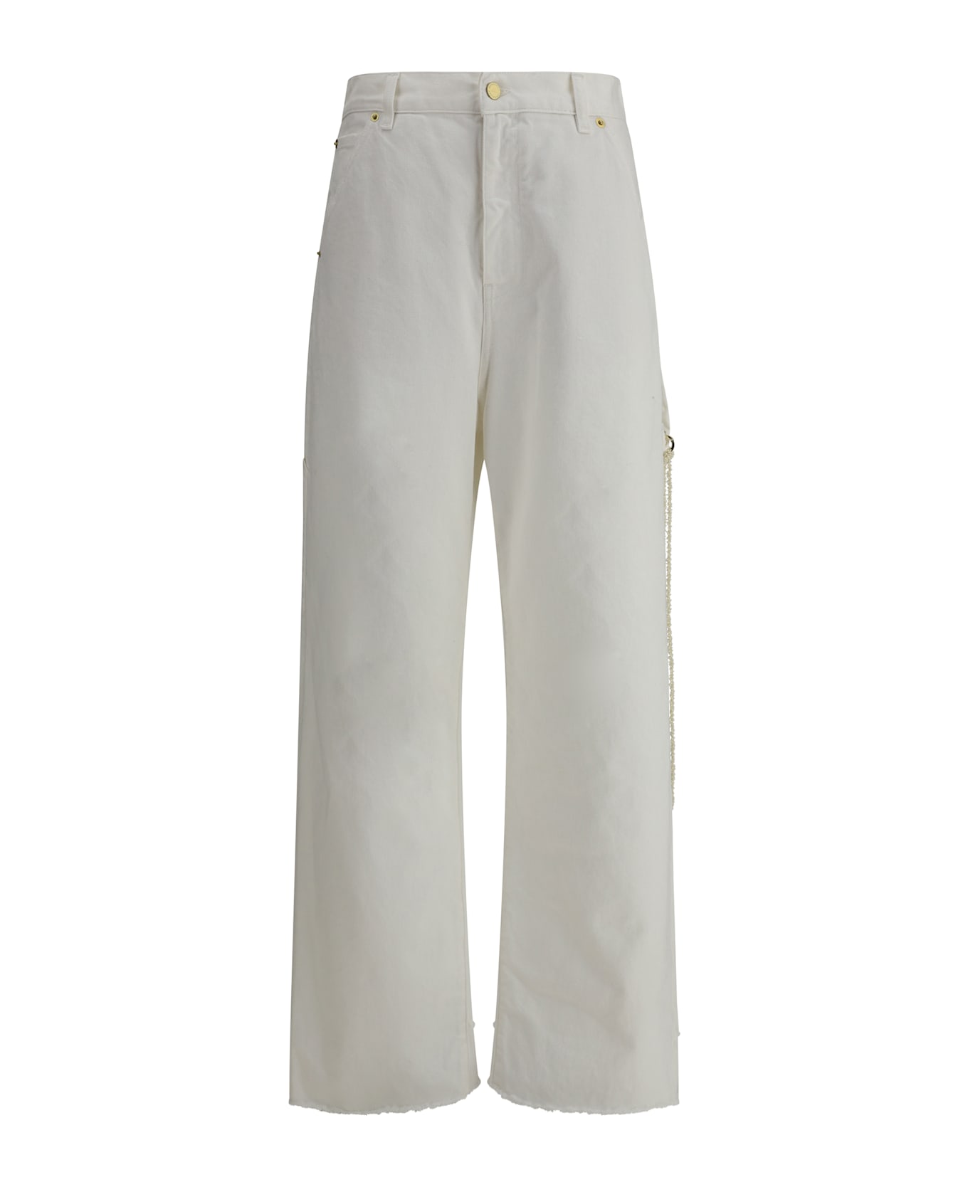 Darkpark's lisa chain jeans are a bold and sophisticated garment, with the classic five-pocket style combining practicality and style. the front zipper and button closure, along with belt loops on the waistband, ensure a comfortable fit. the pearl chain detail attached to the gangue with a hook adds a touch of elegance and originality, while the raw-cut hem and high waist with straight leg create a modern, sleek silhouette. these jeans are ideal for a casual-chic look with a touch of luxury, perfect for those looking for a distinctive, on-trend garment.