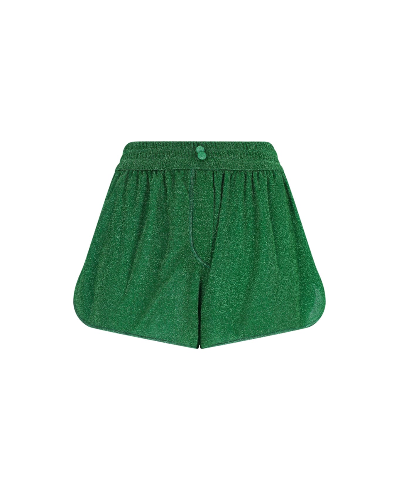 Oséree Lumière sports shorts in green lurex with metallic details, medium elastic waistband, two applied button detail, wide leg. Composition: 64% Polyamide, 36% Metallized Fibers