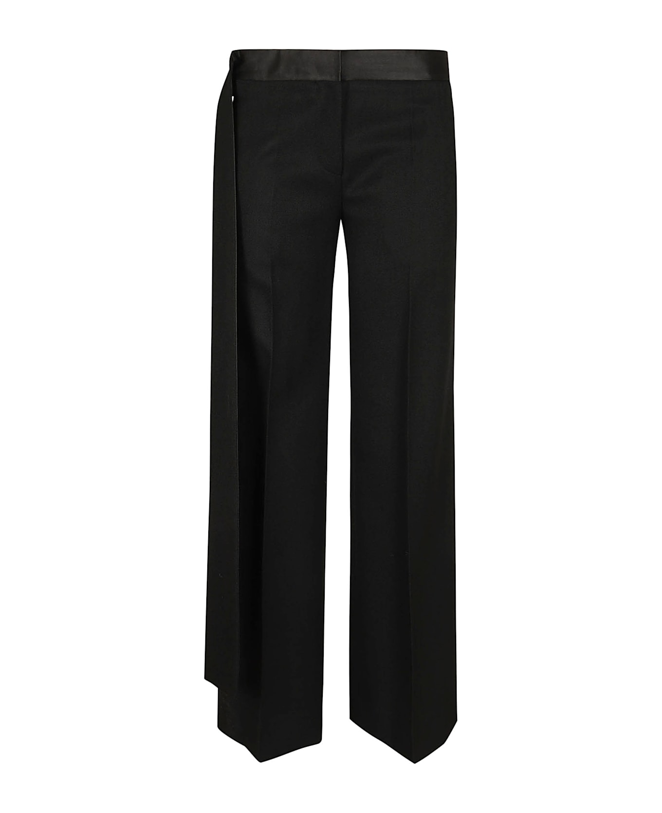 hidden front buttons in black, hook and zip closure two side slit pockets two back welt pockets pressed pleat with satin belt band