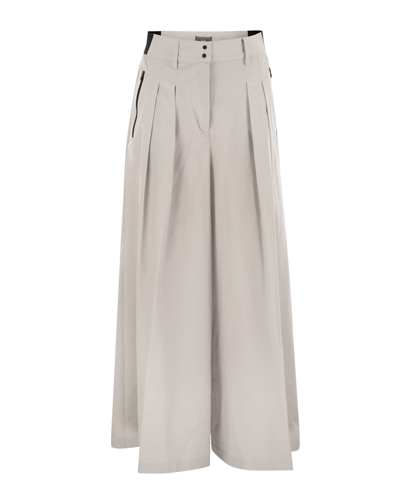 Trousers made of nylon to create a light and opaque fabric. A model with a sporty and dynamic look, finished with functional pockets and darts at the waist to customise the fit. Characterised by a skirt effect look thanks to the particularly wide gabe. - Regular fit - Waist darts - Zip and button closure - Pockets on hips DESIGNER ID: PT000110D12503Z 1250 Composition: 100% Polyester Trimming: 90% Polyamide, 10% Elastane