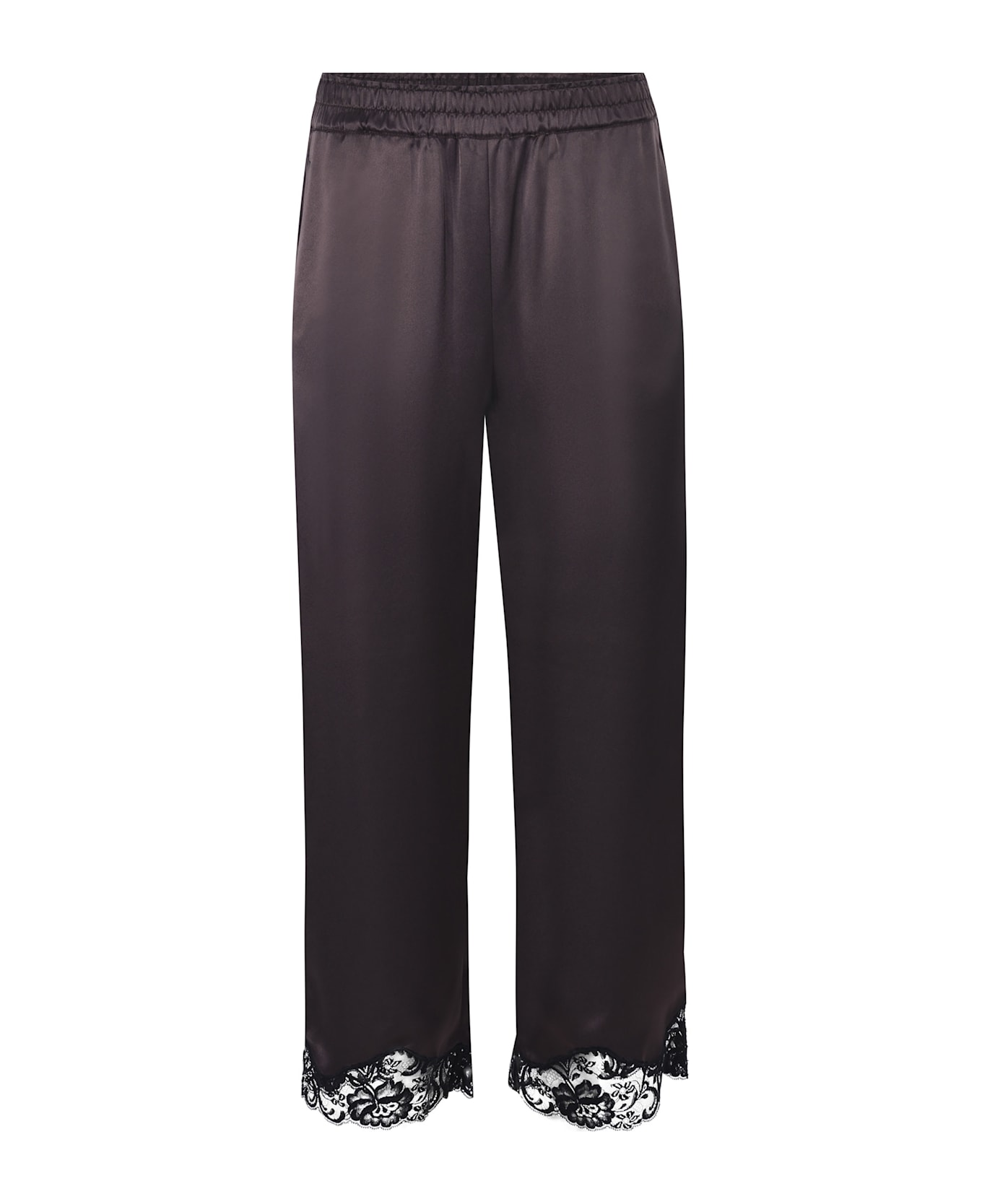 Palazzo trousers Pinko "Pendolo" made of Bordeaux-coloured worked satin. Fluid and shiny texture. Elastic waist. Side pockets. Wide and straight line. Contrasting black lace insert at the bottom. Lace 80% Cotton, 20% Nylon 91% Acetate, 9% Polyester