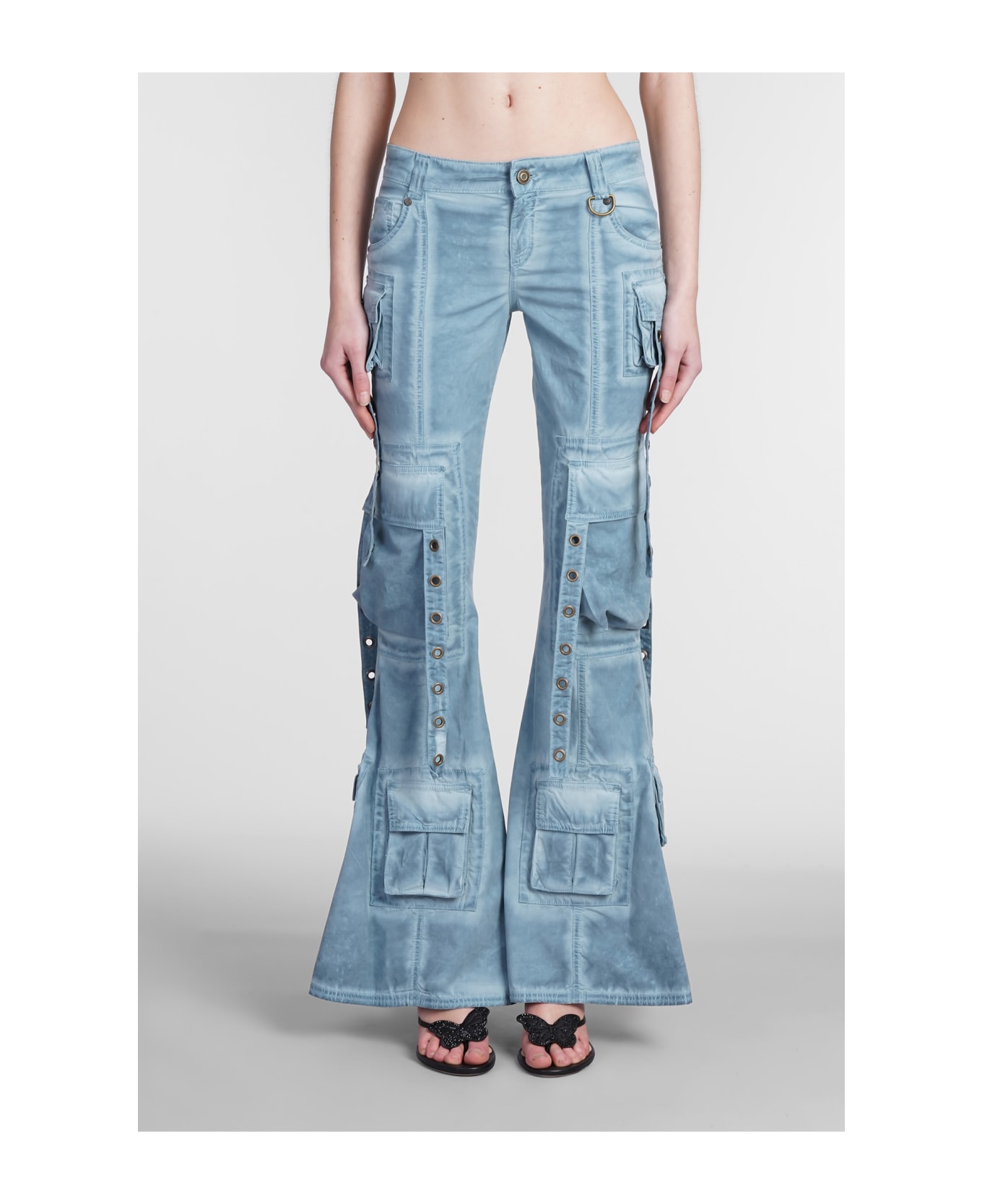 Pants in cyan cotton, flared, cargo pockets, button and zip closure, five pockets, waist belt loops, model is 180 cm and wears size 40, Made in Italy, 97% Cottone 3% Spandex