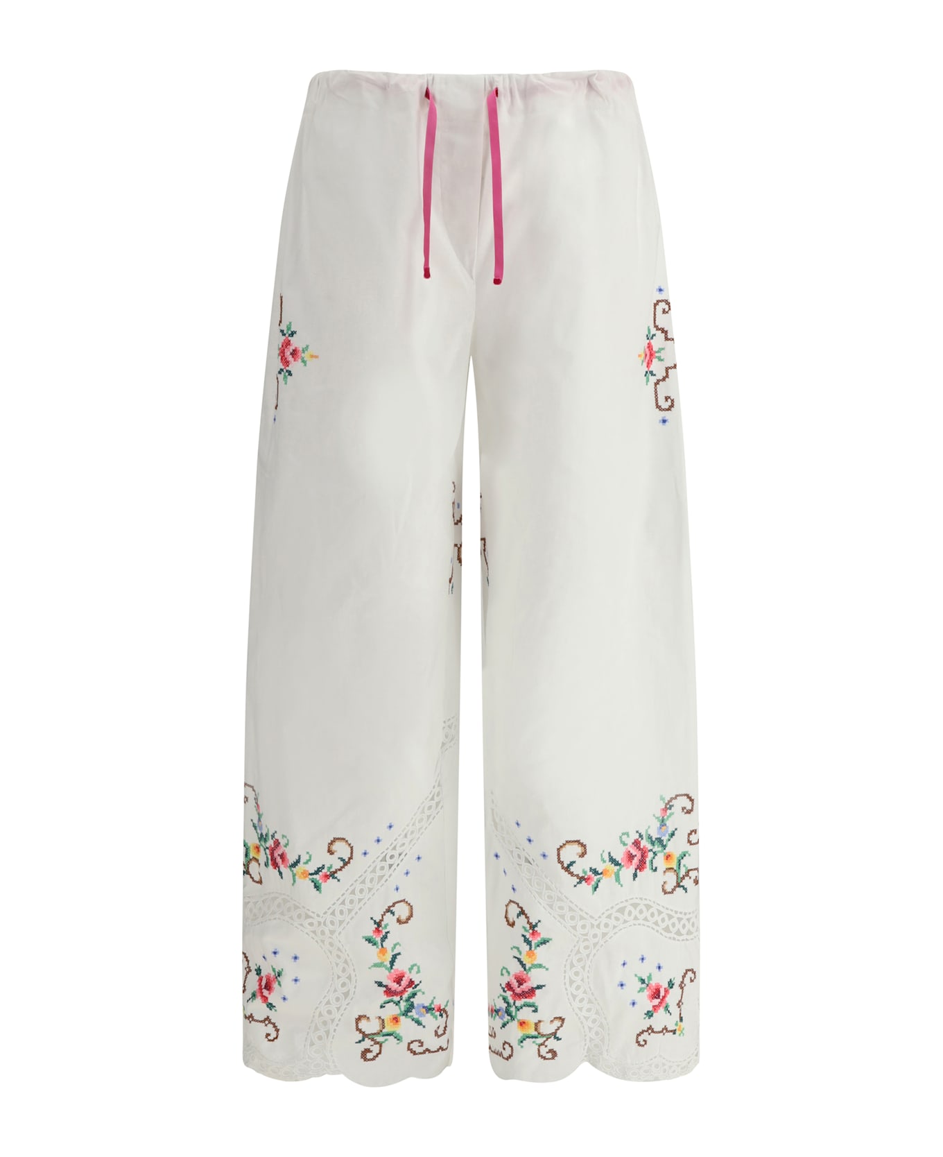 Ella's pants are an elegant garment with assured comfort, featuring an adjustable velvet drawstring waistband that allows for a customized fit. the wide-leg style gives a fluid and sophisticated silhouette, while lace inserts and floral details made with the cross-stitch technique enrich the design, giving it a handcrafted and delicate touch. perfect for creating an elegant yet relaxed look, this pant can be paired with a blouse or simple top for a refined yet never mundane outfit.
