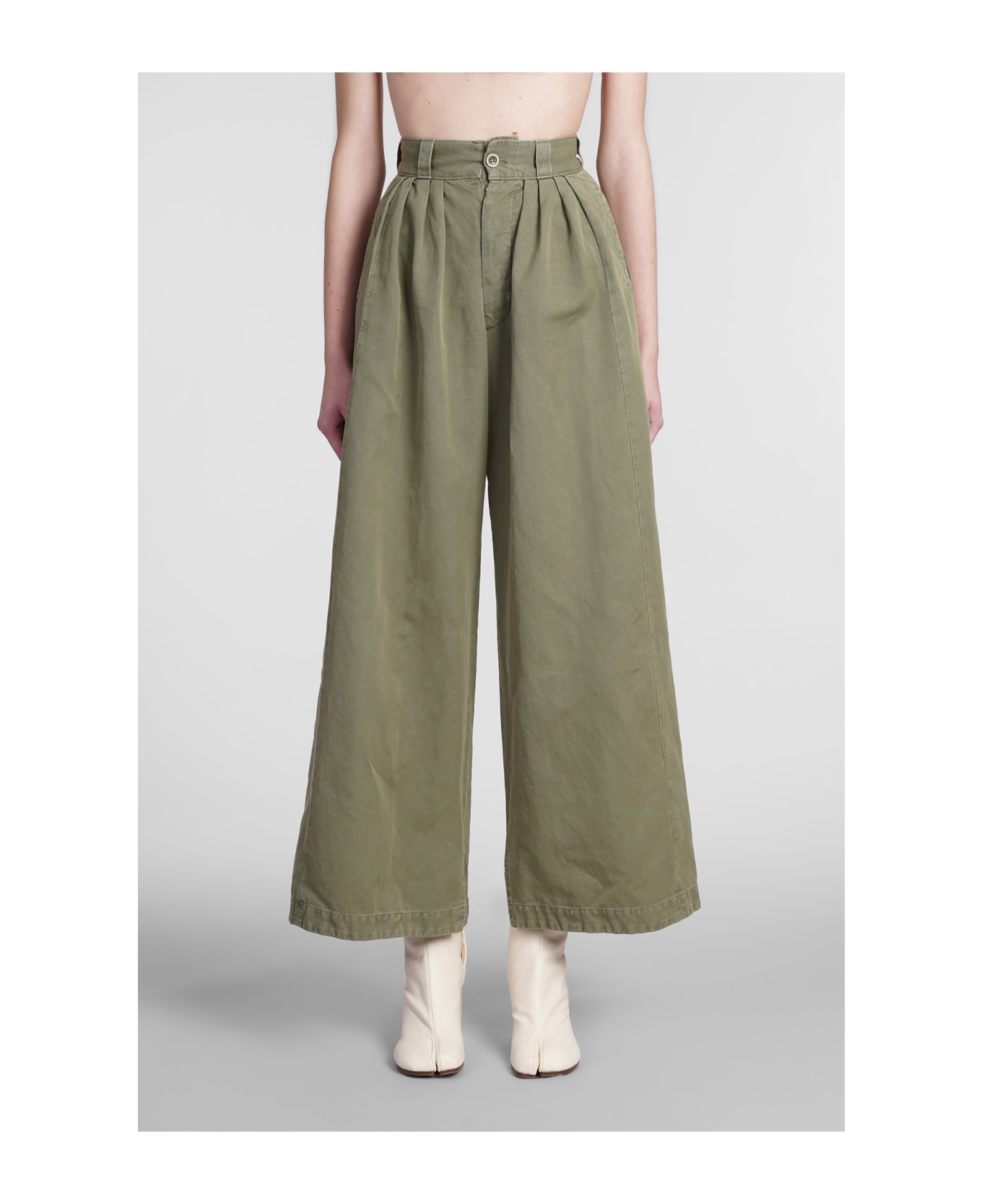 Pants in green denim, high waist, pence, flared style, iconic logo, 57% cotton, 47% linen, Model is 180 cm and wears 38