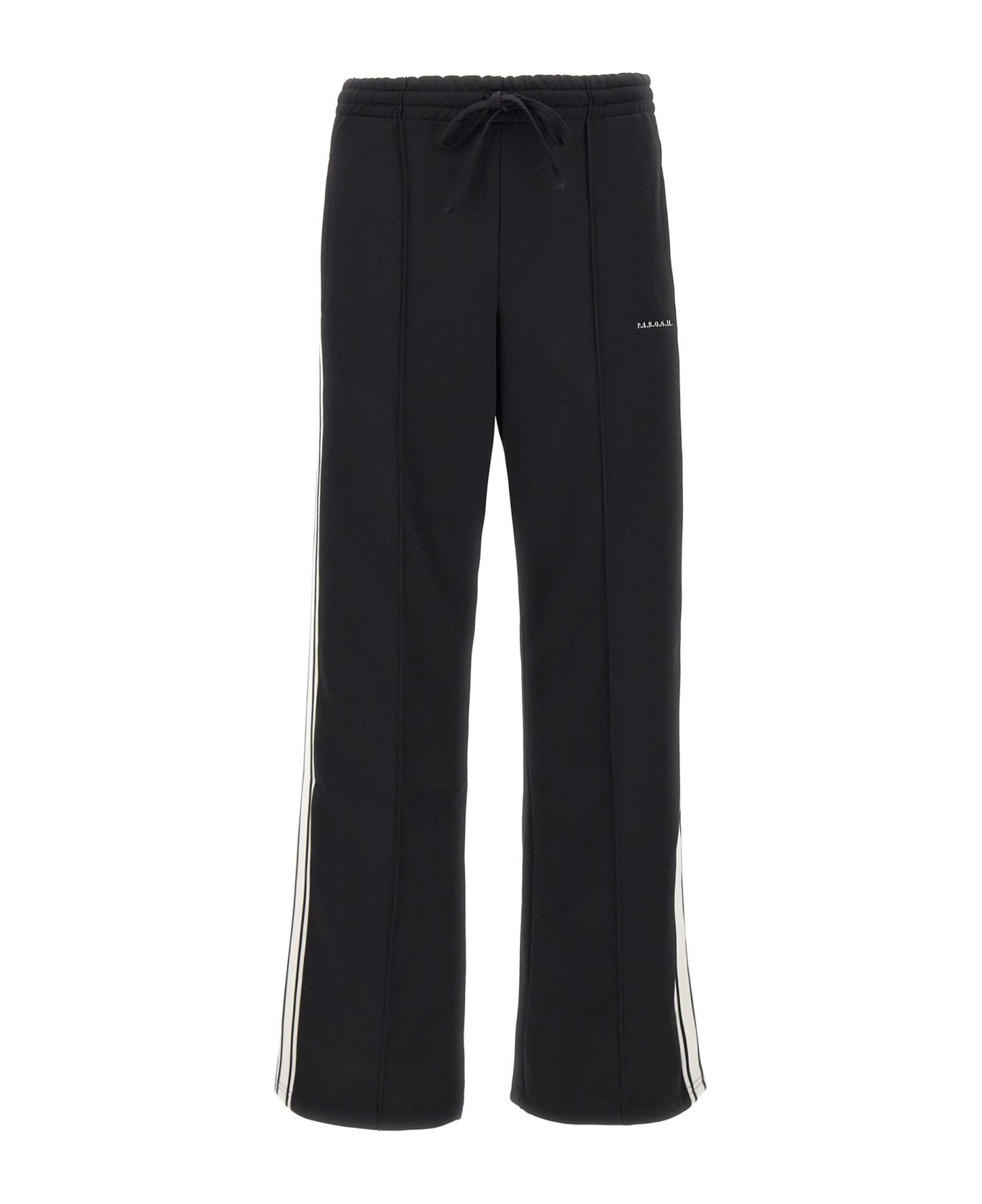 P. A. R. O. S. H. 'Pino' cotton blend pants, elasticated and adjustable waist with drawstring, two side slit pockets, contrasting white side bands, embroidered logo patch on left leg, wide hem. Made in Italy.