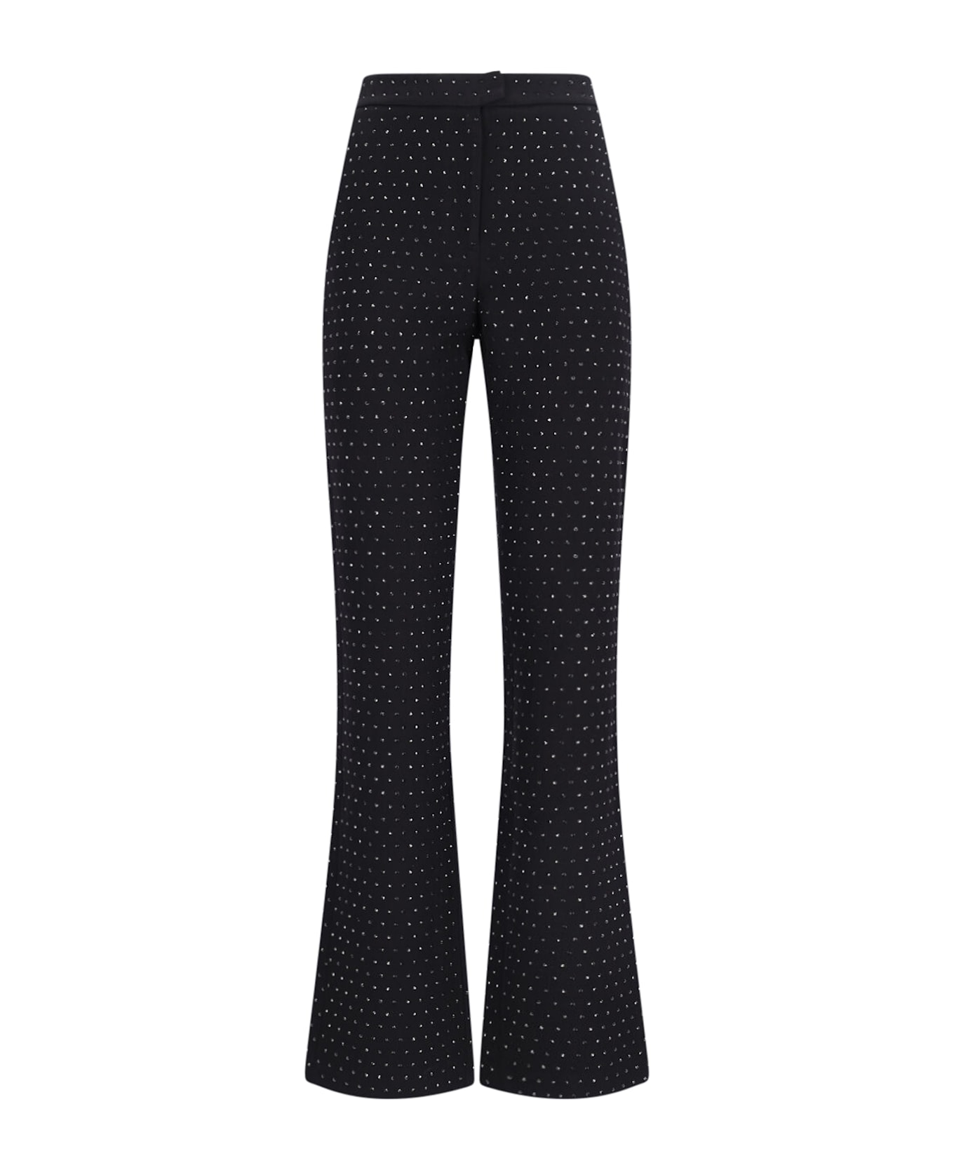 The Andamane rhinestone pants in black fabric with all-over rhinestones, high waist, hook and zip closure, two side pockets, two back welt pockets, straight leg.