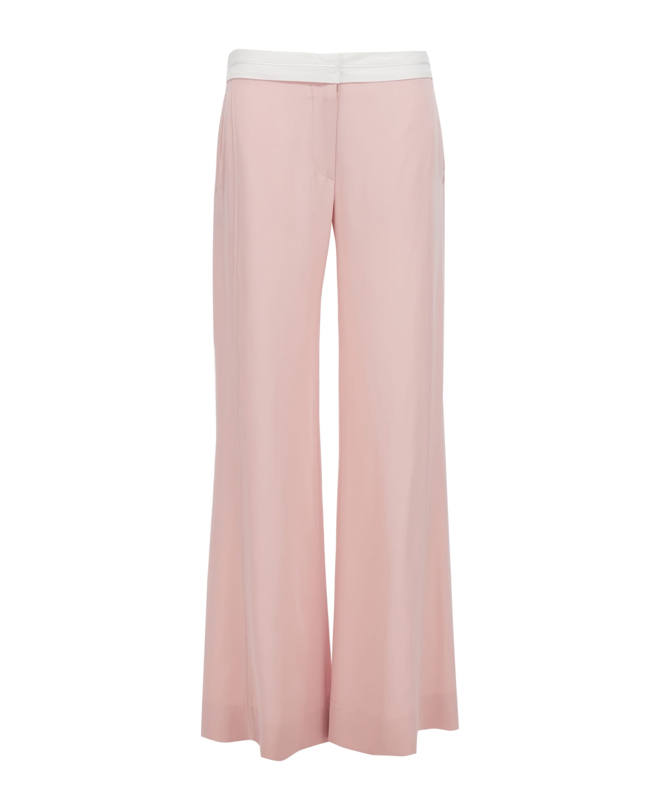 Satin pants with contrast waistband, zip and hook closure, pockets.