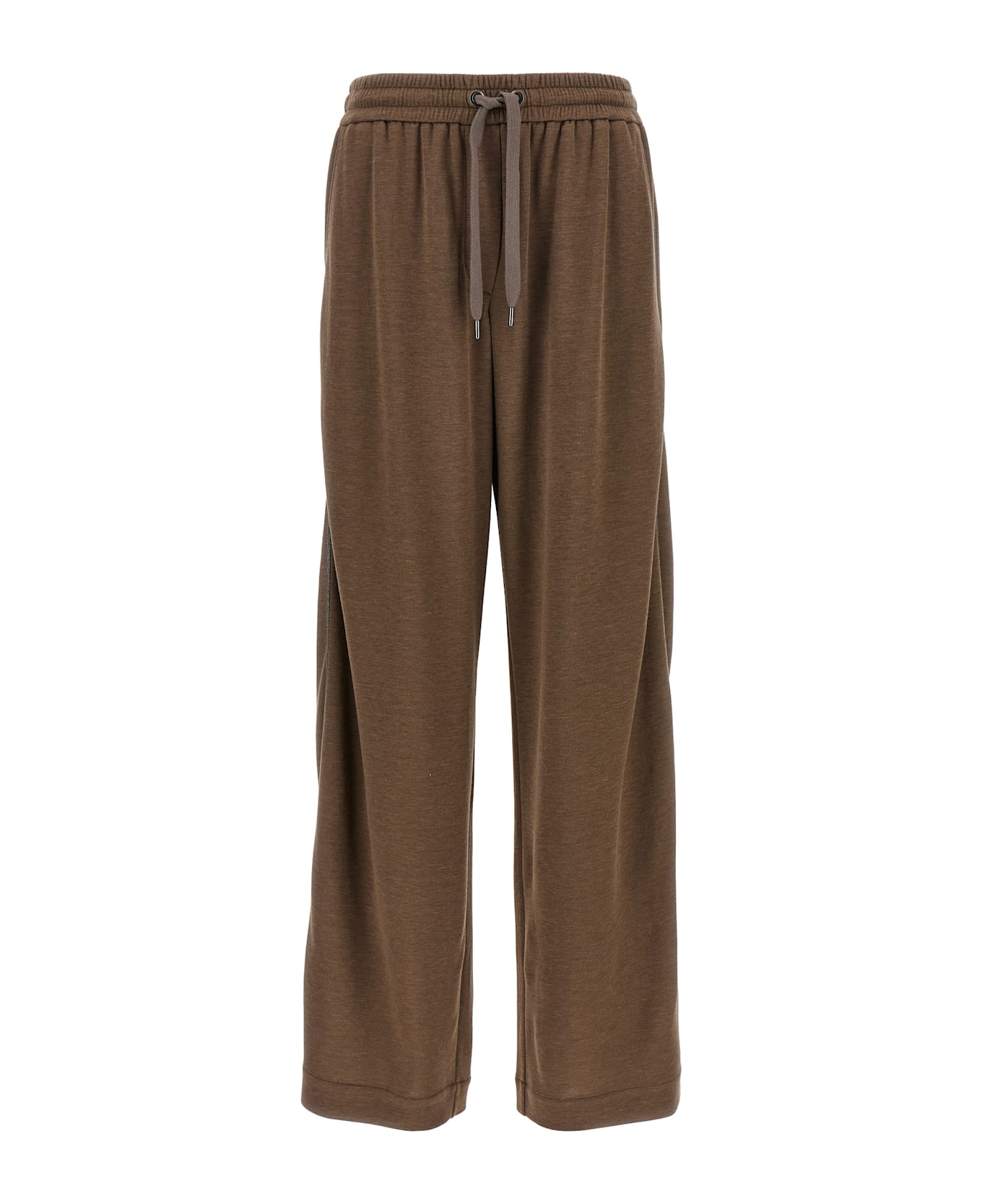 Cotton and silk interlock joggers, side 'Shiny Trims' detail, wide leg, adjustable drawstring elastic at the waist, pockets. Composition: 67% cotton 31% silk 2% polyamide