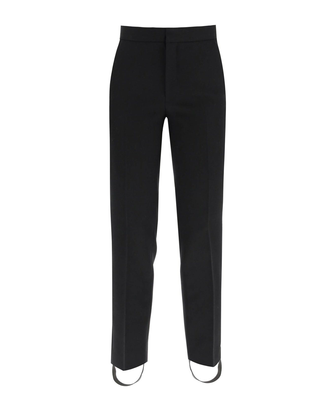 WARDROBE. NYC tailored trousers in wool canvas, featuring concealed zip and hook closure, side French pockets, rear bound pockets, pressed crease, removable stirrups at the hem. The model is 177 cm tall and wears a size XS.