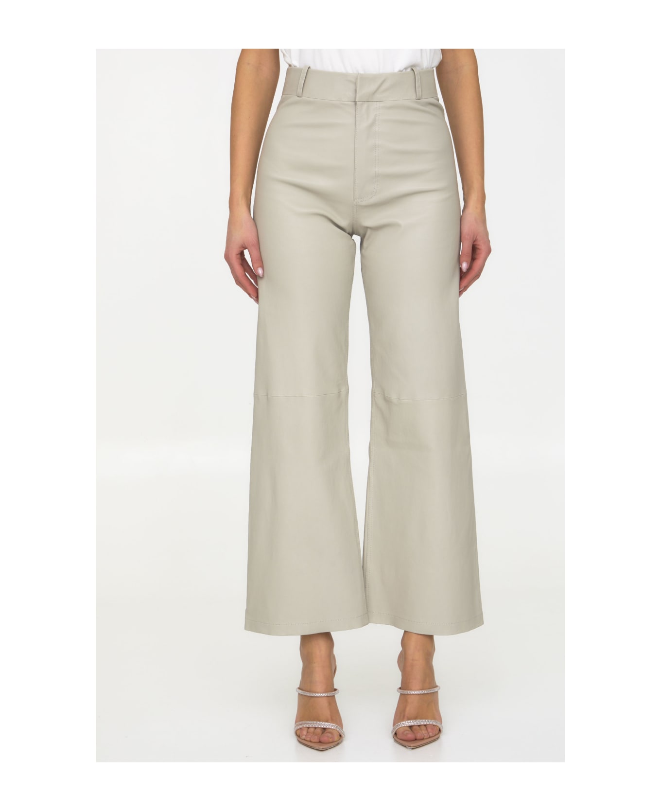 Stretch palazzo trousers in soft putty-colored lambskin. It features high waist, zip and hook closure, two rear patch pockets and belt loops.