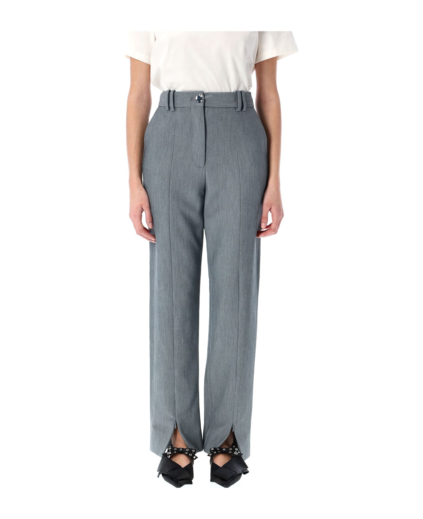 Suiting Trousers By Ganni. Featuring: Mid-rise Waist Button And Zip Fly Belt Loops Side Pockets Asymmetric Back Welt Pocket Front Slits With Hidden Zipper Model Is 1,70 M And Wears Size 36 Composition: 75% recycled polyester, 23% viscose, 2% elastodiene