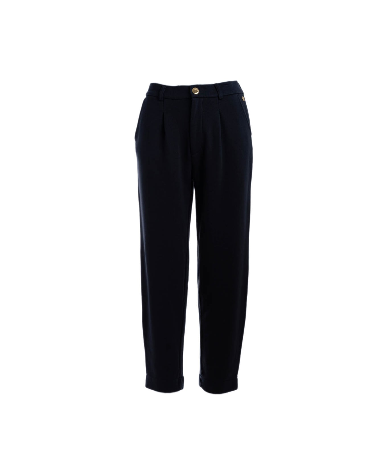 SUN68 woman cotton blend pants, black, soft fit, two side slit pockets, zip fastening, elasticated waist with belt loops and gold button, gold logo patch, ideal for a casual look.